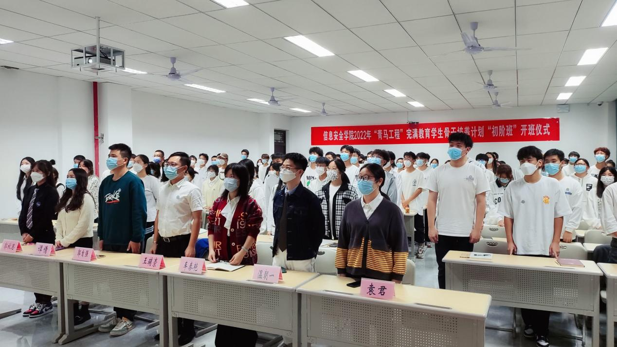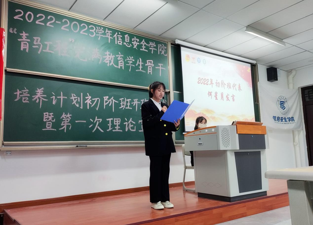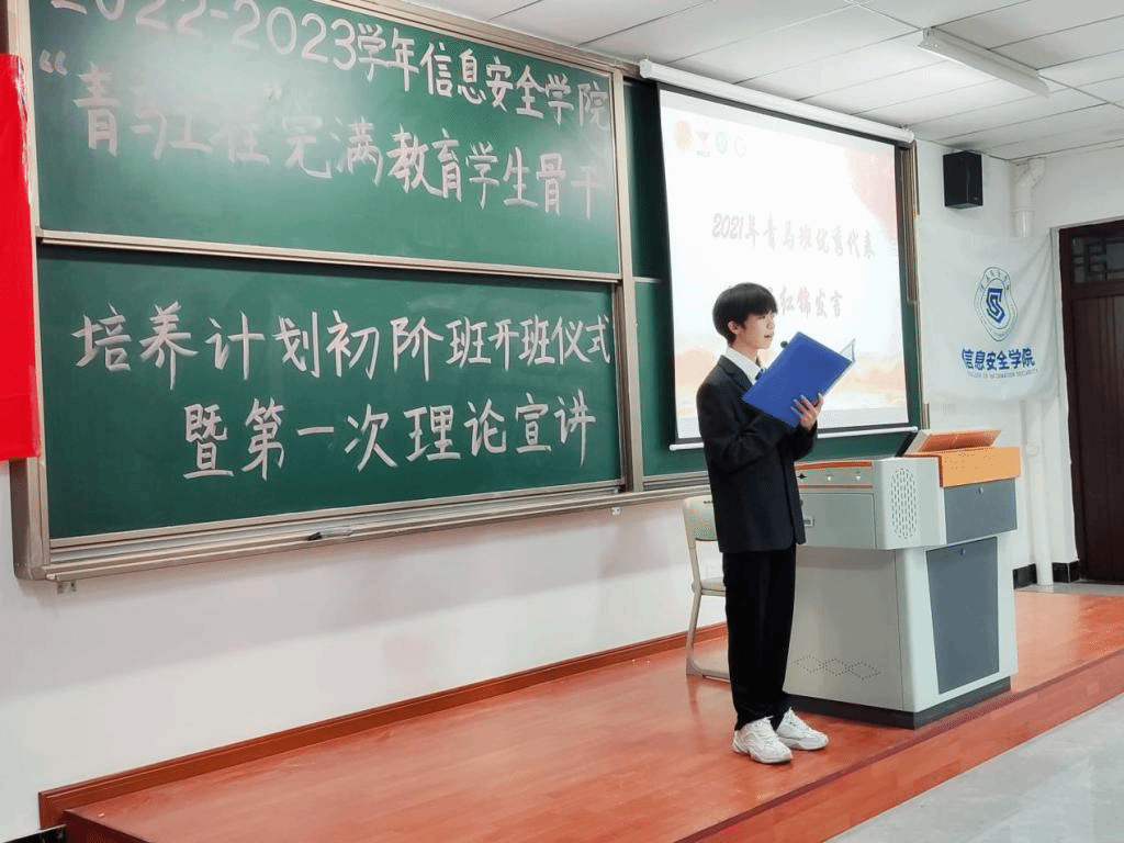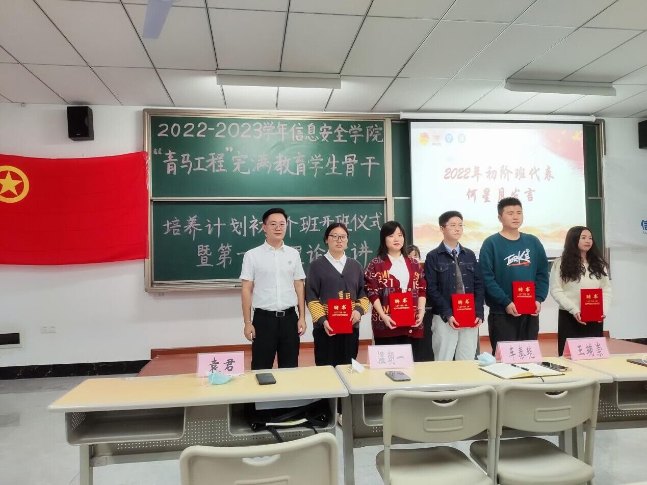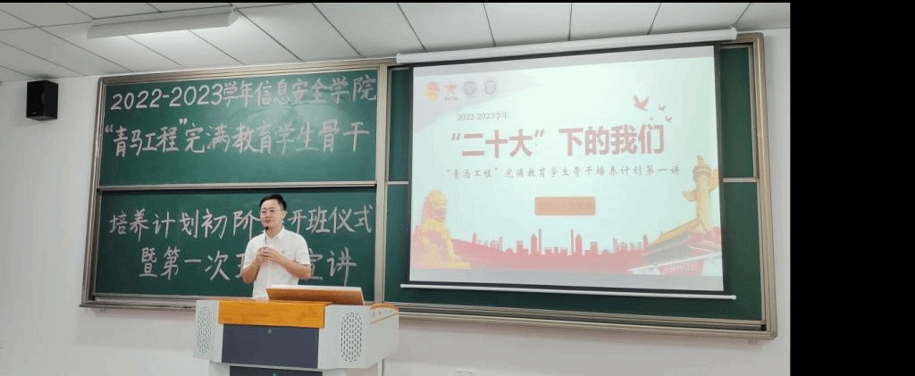 一代人有一代人的际遇,一代青年有一代青年的使命。在党的二十大胜利召开之时,信息安全学院于10月26日19:00,在勤者楼102开展了信息安全学院2022年“青马工程”完满教育学生骨干培养计划初阶班开班仪式暨第一次理论课宣讲。
