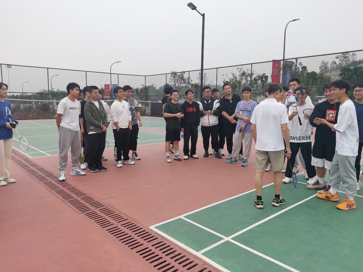 凭借着自己的专业知识与平易近人的传授方式,从开始的如何握拍,如何挥拍,到怎样运用脚步,打羽毛球的重点等几个核心方面给大家进行讲解,随后进行了简单的基础训练,也在实战中细心地指导每一位同学。