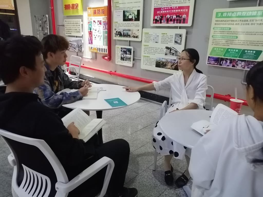10月,唐孝庆老师组织软件工程6班徐海峰、刘永亮、朱忠荣和段宇璐等几位同学在綦河书院中庭展开了小型的读书分享和交流活动。之所以只有这几位同学,是因为他们都喜欢一个人——马云。在分享的过程中,唐孝庆老师希望同学们在学习的同时能够打开视野,增长见识,同时去思考企业家以及企业背后的社会责任,若有兴趣还可以思考背后的企业伦理,将来成为一个有担当有贡献有责任的企业家。