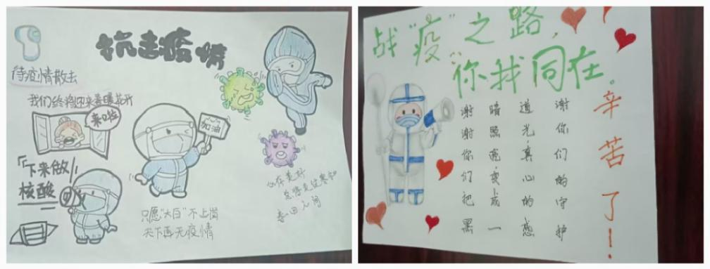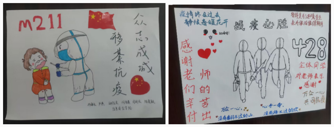 同学们全天候的呆在宿舍,积极与乐观并未因空间的限制而磨灭,众多同学踊跃报名。拿起笔尖,将一句话、一句诗、一个词书写于纸张之上,用文字来寄托自己对志愿者们的所感所思。同学们就身处那“风景线”后,静待花开。