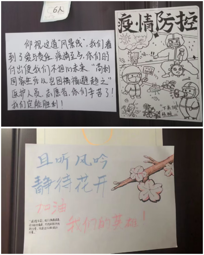 线条将爱勾勒,色彩点燃温情。开门便能取到早已放在门口的餐食,志愿者的辛劳工作都被同学们看在眼里,虽然门将两者相隔,温情却依旧能通过门牌贴传递到各位志愿者的心中。这条看不见的纽带,流淌着专属于移通人的温暖,文字与书画宣告感动曾经出现在这里。