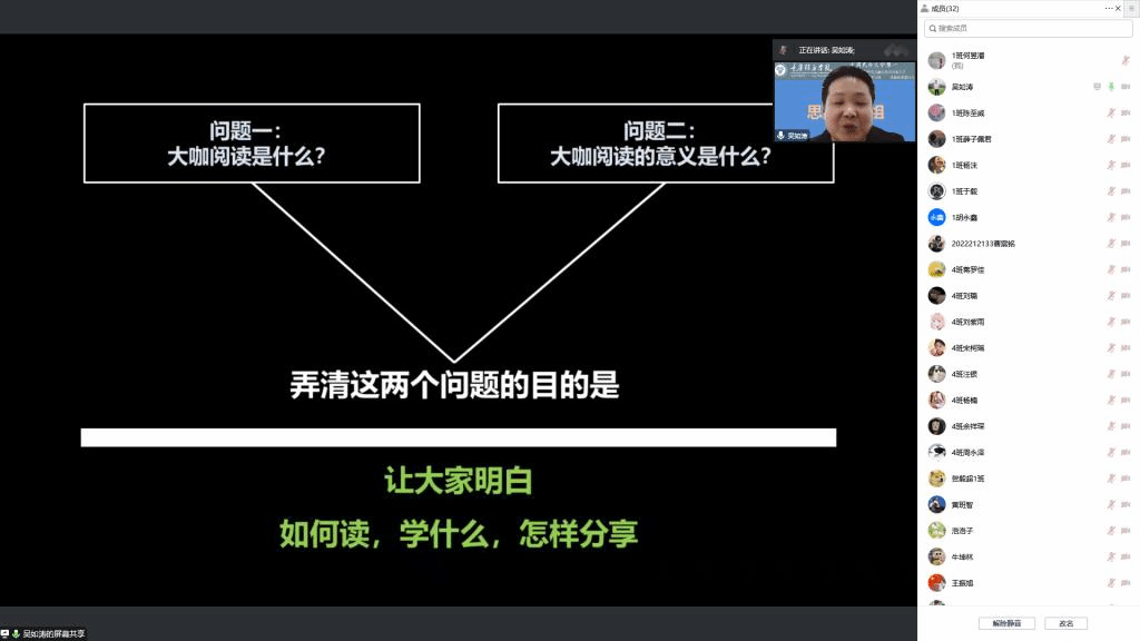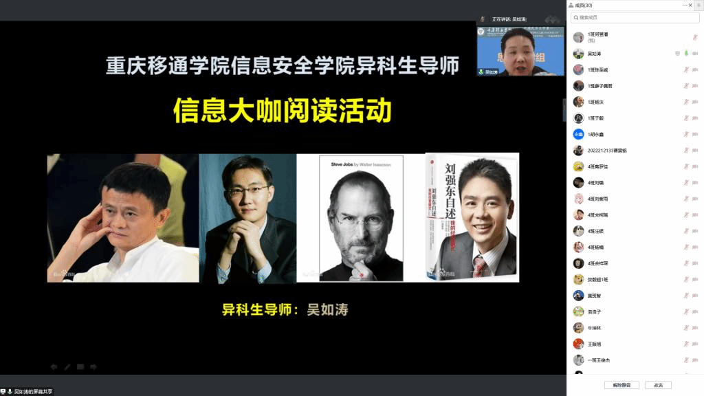 疫情无情,学校大爱,在学校的精心守护下,同学们追求完满人生的步伐,不曾停歇。2022年11月18日,异科导师吴如涛和来自信息安全学院2022级软件工程1班、信息安全4班的35名大一新生利用腾讯会议,进行了线上信息大咖阅读分享活动。