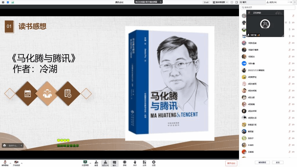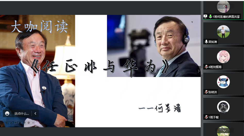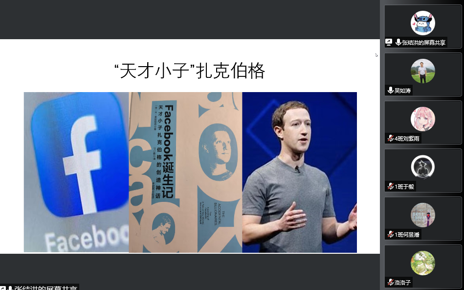 张结洪分享到,天才小子扎克伯格在国会听证会上的表现,被媒体吵作为人工智能、蜥蜴人;于毅在谈及马化腾的成功时,谈及了同学们最为感兴趣的QQ游戏;何昱潘同学分享到了“孟晚舟事件”。这些都是同学们感兴趣的时髦话题,大家讨论的积极性很高,在讨论的过程中,同学们开了反思,扎克伯格的专注,对时间的管理;马化腾在都面临天价收购时的坚持,腾讯游戏在模仿中的超越;任正非的坚韧、责任感以及“老骥伏枥,壮心不已”。
