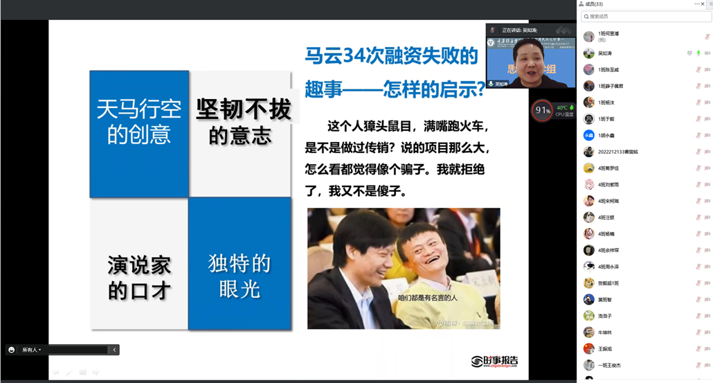 探讨结束后,异科导师吴如涛率先作了大咖阅读分享,当异科导师吴如涛分享到马云找雷军融资,被雷军形容为“獐头鼠目,满嘴跑火车”,被怀疑“是不是做过传销”时,同学们都笑了。笑过之后,同学们都陷入了沉思,同学们谈到在抖音、快手上刷到不少马云讲的段子,很多知名企业家也如此,大家纷纷表示好的口才是信息大咖成功的原因之一。