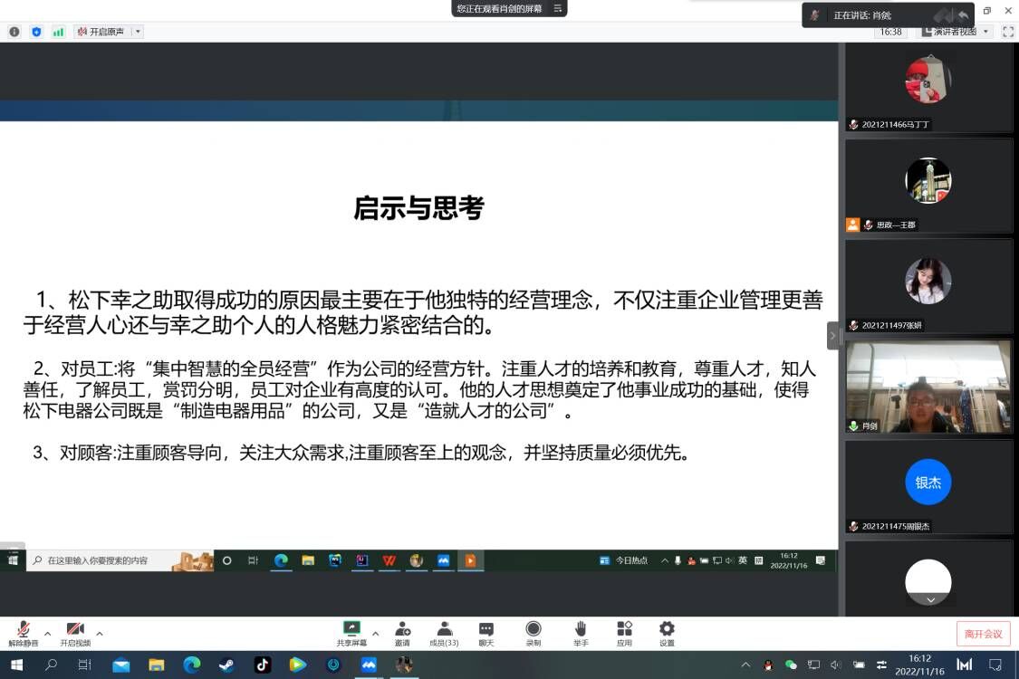 接着肖剑同学和大家分享了《松下幸之助全传》,从“自来水论”和“以人为本企业之源”两个方面介绍了松下幸之助取得成功的秘诀。松下幸之助取得成功的原因最主要在于他独特的经营理念,不仅注重企业管理更善于经营人心还与幸之助个人的人格魅力紧密结合的。对员工:将“集中智慧的全员经营”作为公司的经营方针。注重人才的培养和教育,尊重人才,知人善任,了解员工,赏罚分明,员工对企业有高度的认可。他的人才思想奠定了他事业成功的基础,使得松下电器公司既是“制造电器用品”的公司,又是“造就人才的公司”。对顾客:注重顾客导向,关注大众需求,注重顾客至上的观念,并坚持质量必须优先。