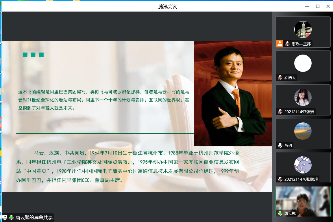 最后唐云鹏和同学们分享了《马云:未来已来》。唐云鹏通过介绍马云走向成功的坎坷过程让大家认识到:任何事情都应该以未来看待它,不能但以你现在的能力来对待。我们要从实际出发,目光放长远,对未来进行预测,不是对当前状况进行随波逐流。不要每天浑浑噩噩, 梦想还是要有的,万一有一天实现了呢?