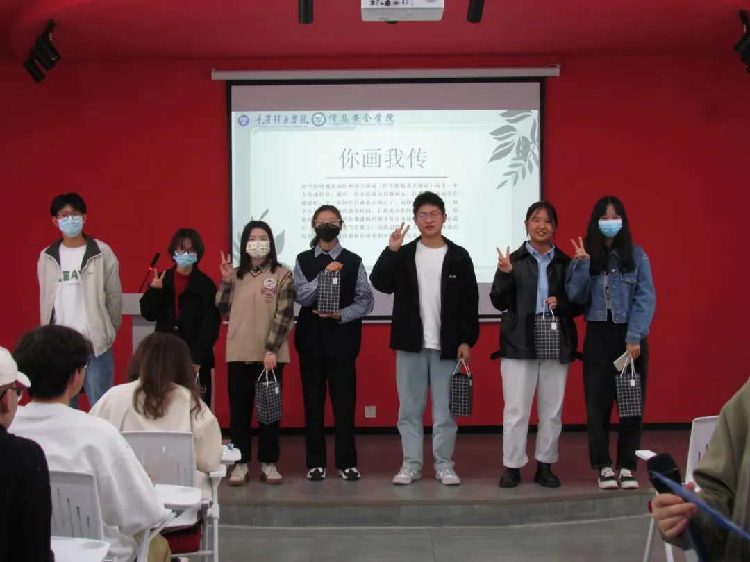 培训后进入实践环节——“你划我猜”。场上同学共分为4列,由每列第一位同学根据自己所见,在不透露关键信息的情况下,依次向后传达,直至最后一位同学说出答案。经过激烈比拼,第4列小组同学胜出,收获礼品作为奖励。