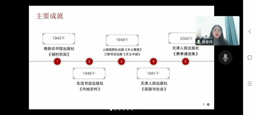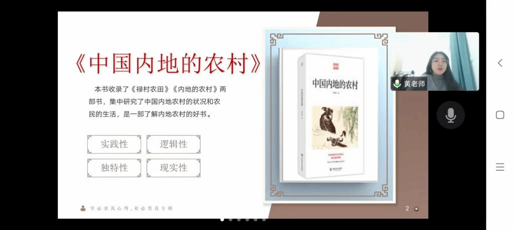 本次会议在黄秋燕老师的分享中展开。黄老师为大家分享了《中国内地的农村》。本书作者费孝通先生的生平在黄老师的描述中娓娓道来。紧接着,她从读书意义、农业农村农民、分享总结与书单分享四个方面展开了本次的分享。她认为正是由于中国共产党始终坚持党管农村的优良传统、坚持城乡融合的体制要求、坚持改革创新的时代精神与坚持人民至上的根本立场,我们国家才能在农村问题上取得巨大成就。最后,她倡导同学们一定要多去图书馆多读书、读好书,养成好读书的习惯。