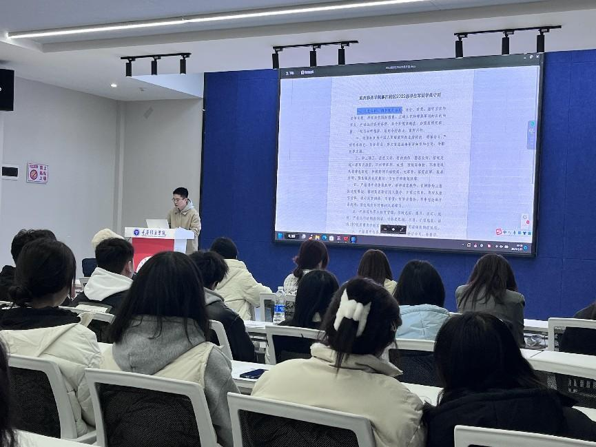 2023年2月18日,各辅导员在阶梯教室召开安全教育大会,并向将要军训的同学讲授军训学员守则。希望同学们在之后的军训期间能遵守条例、严格要求。