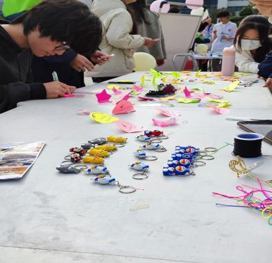 活动开始前十分钟已经有参与活动的同学陆续到达活动场地,在领取邀请卡处等待活动的开始。16点30分活动正式开始,参与者手持邀请函奔向各个子活动,“愿望帮你送”活动备受欢迎,仅在短短几分钟的时间里权益部的活动地点前已经排出长龙般的队伍。此活动的展现形式是女生现场手工编制手链或戒指以及在便利贴上写下自己的小小心愿,留下联系方式并将手链与便利贴放在一起,而男生则是找一个女生的愿望帮她实现这个愿望,活动参加完之后每人可领取一个自己喜欢的钥匙扣或者是小发卡。