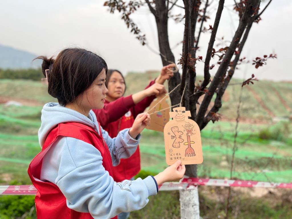树木涂白后,志愿者们在涂好的树木上绑上了心愿卡片,卡片上面图画着,书写着一些对于这个节日、这次活动或是对于之后自己的期望。“春风十里,‘植’属于你”植物节活动不仅吸引了许多的同学,大家认真学习,彼此合作完成树木的涂白。活动氛围热闹,提出了植树的形式,倡导人们针对不同季节特点,通过多种方式、不受季节限制地履行植树义务。此外,志愿者们还宣传了绿色、低碳、环保的生活方式,鼓励人们以实际行动,助力“双碳”达标。在活动结束后,参与植树活动的志愿者与各位书记社区工作人员们合影留恋。