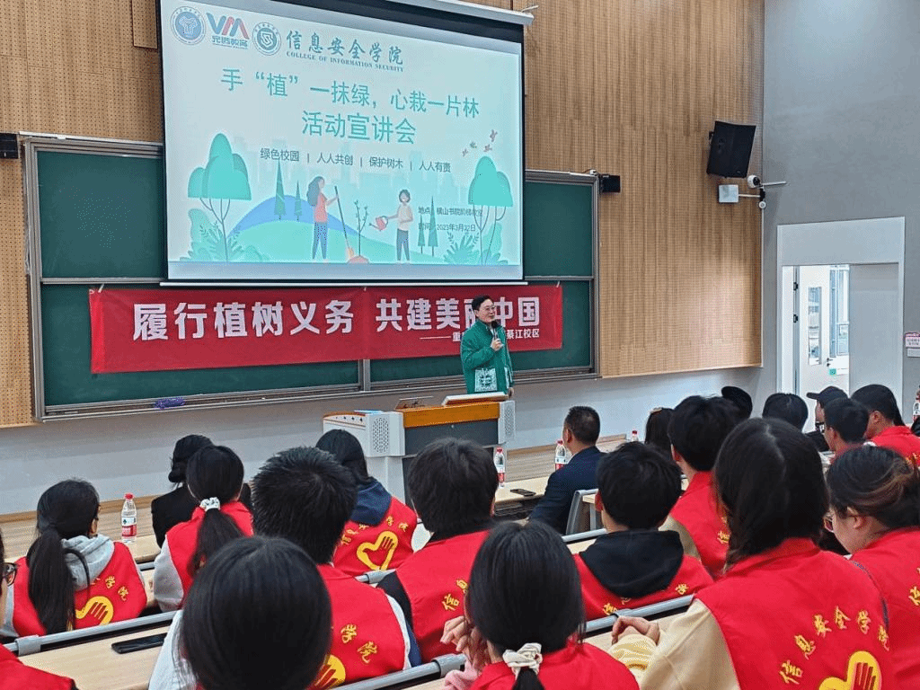 冬季的寒意还未退尽,春天就带着绿色的气息向我们走来。在这个充满生机的时刻,为给我们的家园增添一点绿色。信息安全学院2021届物联网二班班团支队等一百余名志愿者们于3月22号下午在綦江校区横山书院阶梯教室举行了手“植”一抹绿,心栽一片林植树节志愿服务活动,本次活动是綦江校区第一次由学生参与的植树活动,活动与重庆大哆农业开发技术有限公司和学校基建后勤处联合组织、共同参与。