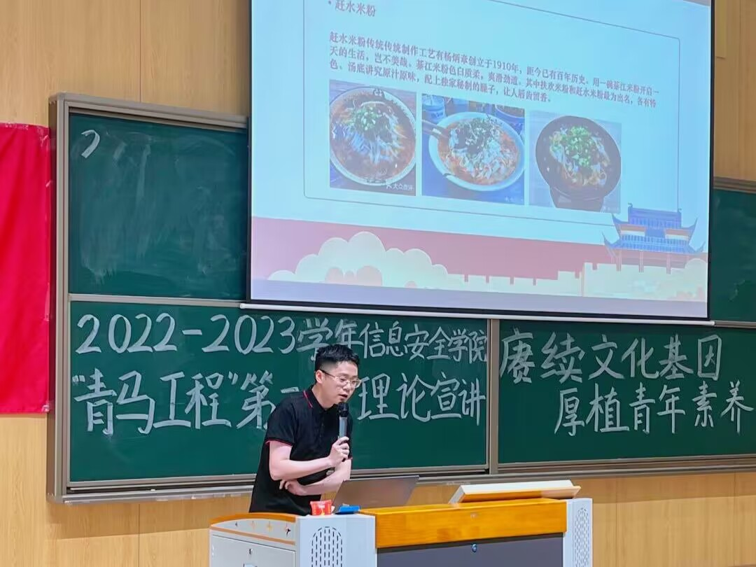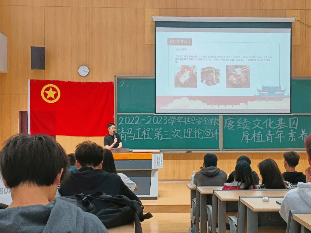 非物质文化遗产是人类通过口传心授,世代传承的文化遗产,是一个民族的生命记忆和充满生机的文化基因,他体现着一个民族的智慧和精神,作为新时代青年在非遗保护和传承的进程中,发挥着举足轻重的作用,还肩负着传承和发展非物质文化遗产、弘扬中华优秀传统文化的时代使命。信息安全学院于2023年3月22日16点在玉棠书院阶梯教室举办青马工程第三次理论学习,本次理论学习授课老师为温朝一老师,青马工程初阶班113名学生参加了此次会议。