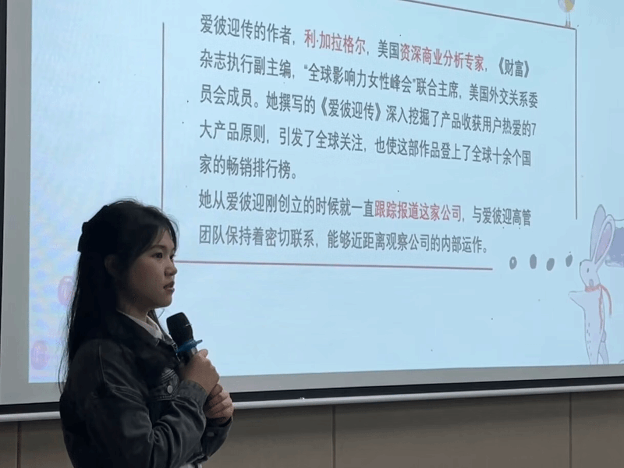 金智莉同学首先对爱彼迎公司产品进行了介绍,Airbnb(以下称爱彼迎)于2008年成立于美国旧金山,通过提供在线民宿短期租赁服务,以C2C的形式连接旅客与个人房东,切入传统OTA的垂直细分领域。2017年爱彼迎正式上线中国区应用市场。2019年初,爱彼迎宣布连续两年实现盈利,房源累计预定人次超过5亿。如今,爱彼迎已经成为估值300亿美元的独角兽公司。金智莉同学认为爱彼迎成功的第一个秘诀精准抓住用户痛点,给房子拍照,当代在网上选房间,主打一个冲击。第二个秘诀花高成本建立定价系统,打造了一套核心算法软件,帮助房东定价。第三个秘诀建立“四海为家”的品牌文化,爱彼迎在房东和房客之间建立了情感纽带。而她在最后看完书才知道原来Airbnb 成立至今只有11年时间,可是它却颠覆了以往传统的住宿理念,推动了点对点住宿的新模式,成为共享经济的典型代表。Airbnb一直以来坚持倡导的服务文化——打破人与人之间的壁垒,提供最真实的旅行生活。创始人很厉害,已经成为行业标杆了还依然在孜孜不断地创新,推动企业从一元化向多元化转变,对比国内共享商业大赚一笔拍拍屁股套现闪人的行为,真可谓云泥之别。