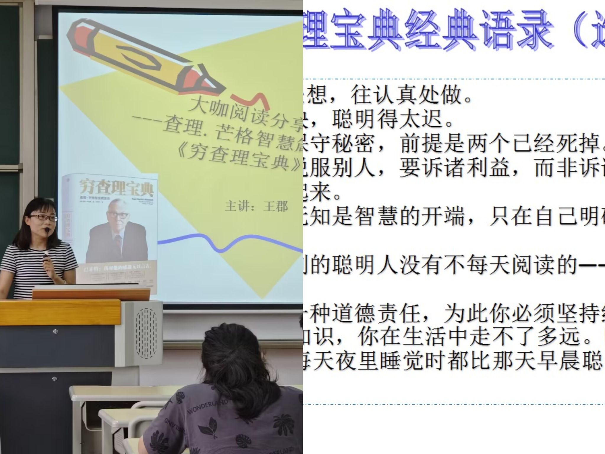 接着,王郡老师和同学们分享了查理.芒格智慧箴言录《穷查理宝典》。王老师首先对查理.芒格进行了简单的介绍,接着重点介绍了查理.芒格生活学习和决策的七大方法。第一,每一项投资都需要从风险评估开始。第二,保持独立思考的习惯。第三,大量的准备工作可以帮你避免“裸奔”的危险。第四,谦让,懂得自己的长处和别人的优势。第五,合理配置手头的资本。第六,保持永不衰竭的耐心。第七所有的诀窍在于不断学习。比亚迪股份有限公司董事长兼总裁王传福说:“人们常说查理是行走的百科全书,见面才知查理更是位富有洞察力的思想家,对科学技术的发展极具前瞻性,这些造就了他对企业和经济发展的独特见解。查理的睿智在字里行间直面扑来,给我们企业家、财富创造者深远的启迪和鼓励!”