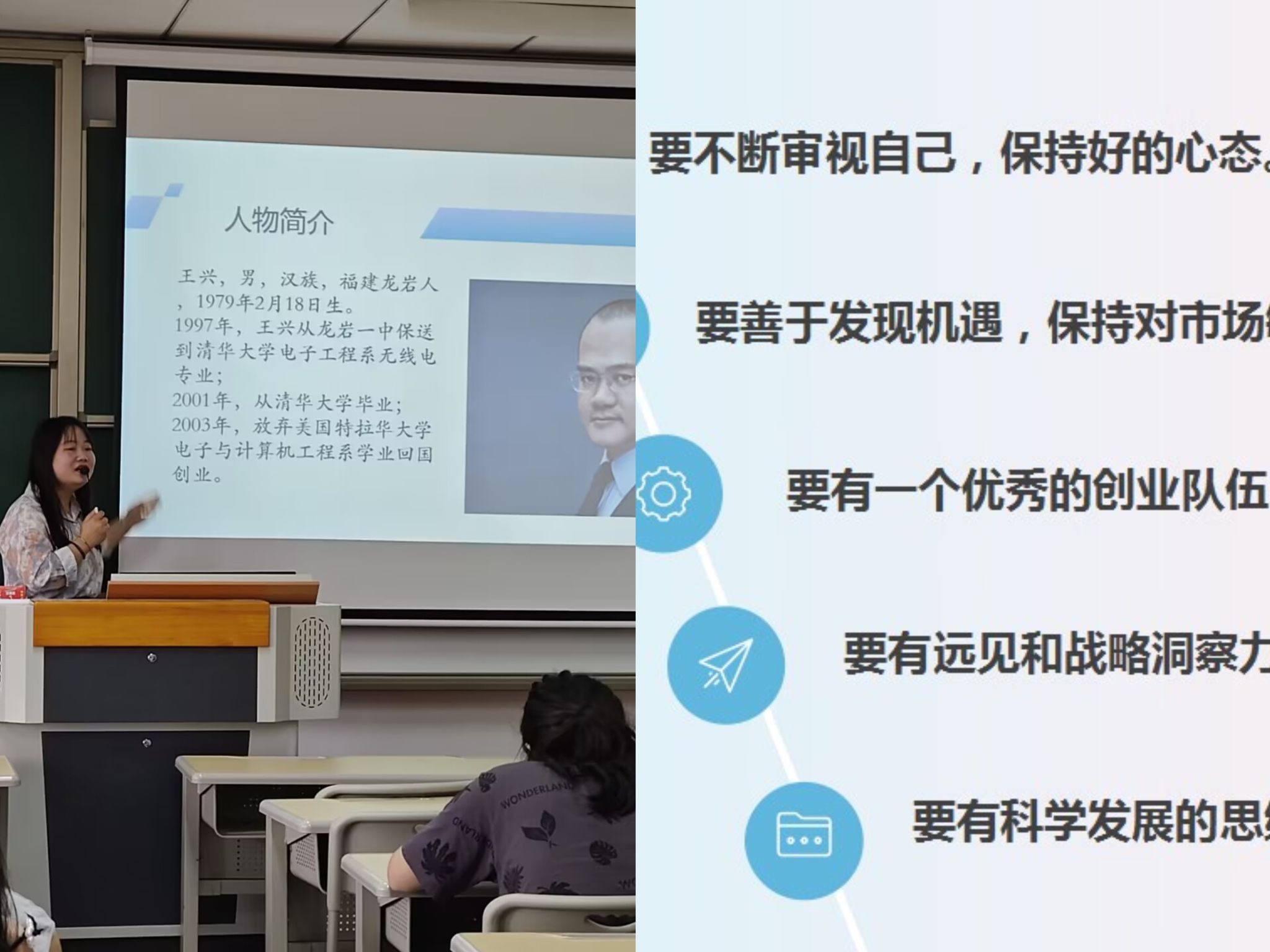 首先,马克思主义学院覃志蓉老师分享了《王兴传:人生不设限》。覃老师首先对美团创始人兼CEO——王兴的创业经历和成就进行了简单的介绍。接着介绍了王兴成功的四个原因:第一,关注市场动态,抓住市场机遇;第二,有战略洞察力,对自身的不断反思;第三,保持良好的创业心态;第四,拥有优秀稳定的核心团队。最后,覃老师重点讲解了王兴成功经历给我们的启示。要不断审视自己,保持好的心态;要善于发现机遇,保持对市场敏锐的洞察力;要有一个优秀的创业队伍;要有远见和战略洞察力;要有科学发展的思维,重视开拓创新。