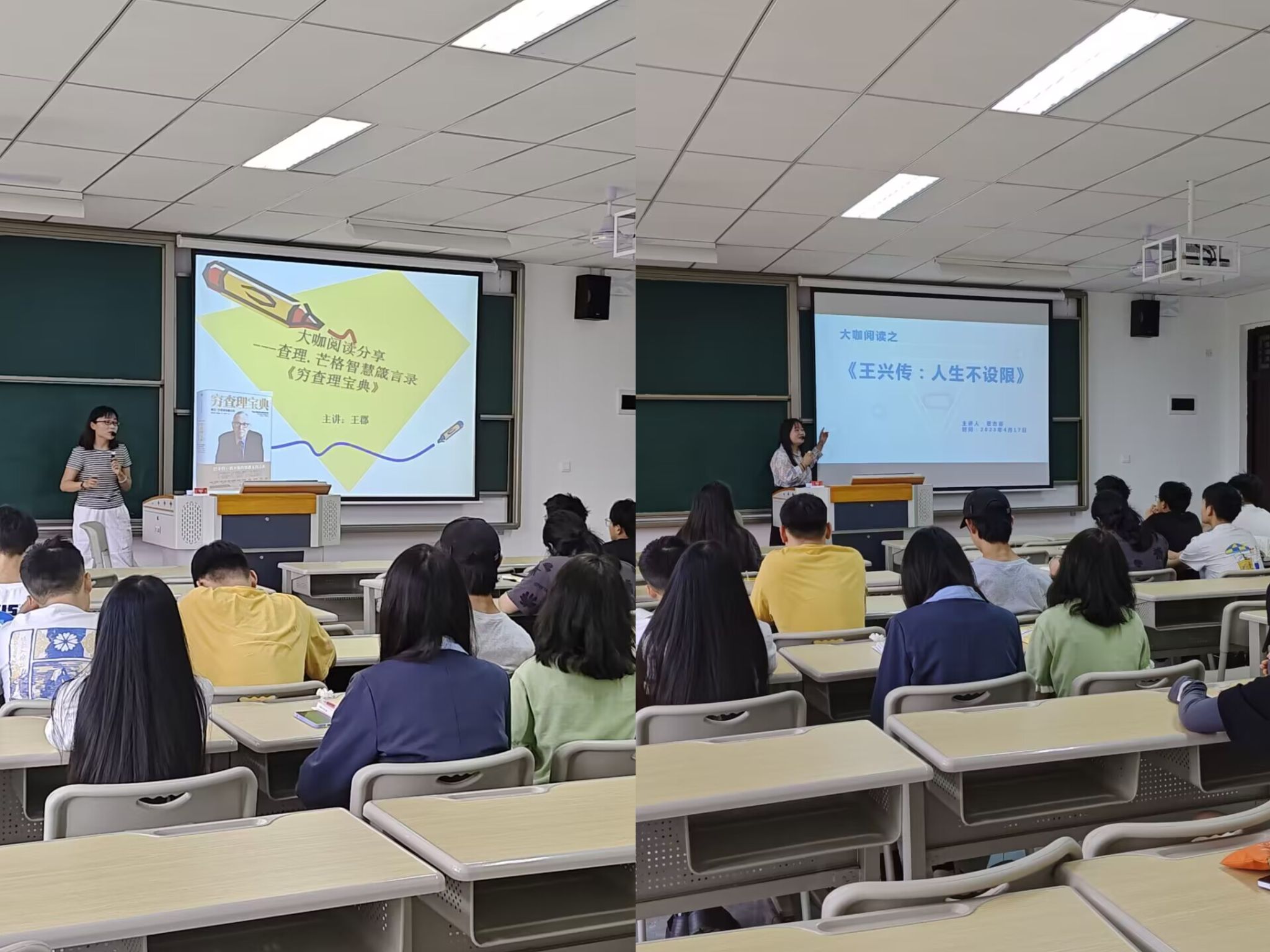 两位老师分享结束后同学们进行了激烈的讨论。同学们纷纷表示从大咖身上领悟到了成功的秘诀。 所谓“知人者智,自知者明”,每个人应该对自己有清晰的认识,在自己强势的范围内活动。通过广泛的阅读把自己培养成一个终生自学者;培养好奇心,每天努力使自己聪明一点点。每天慢慢向前挪一点。到最后——如果你足够长寿的话——大多数人得到了他们应得到的东西。