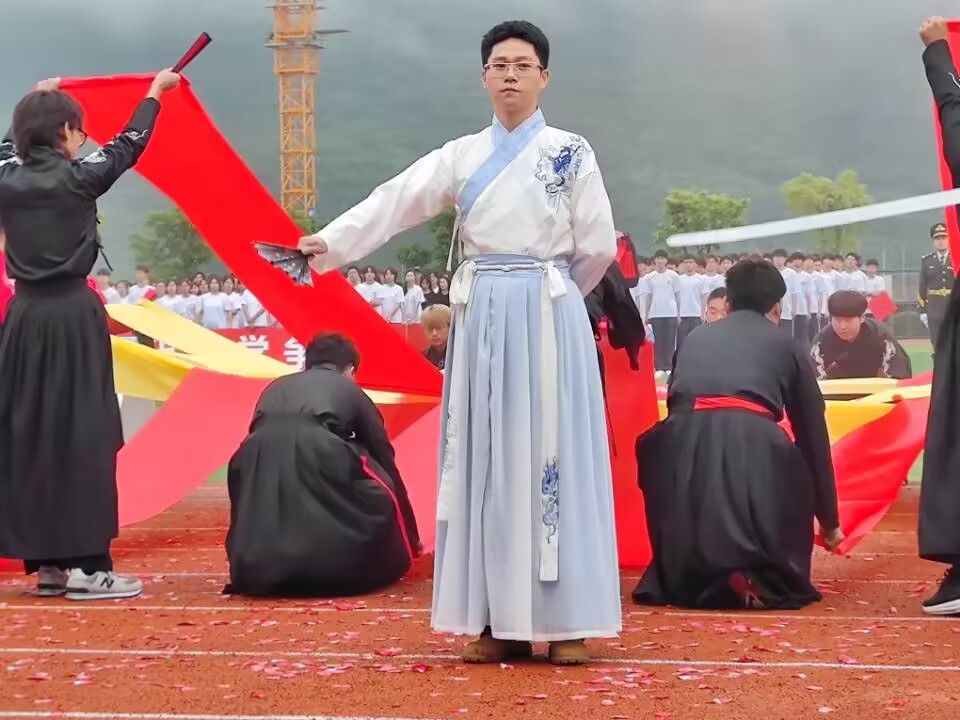 信安的辅导员们亦于歌舞中,身着汉装,手持长剑、舞扇,挥动俊秀的舞姿,展现独属于信息安全学院的辅导员魅力。表演余音,红色和黄色的条幅交织错落组成词句“青空燕起,追风逐梦,一路青青,终有所成”,寄愿了信安对运动员们的美好期待。