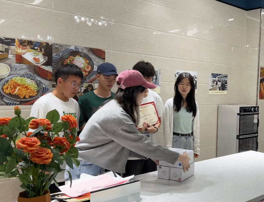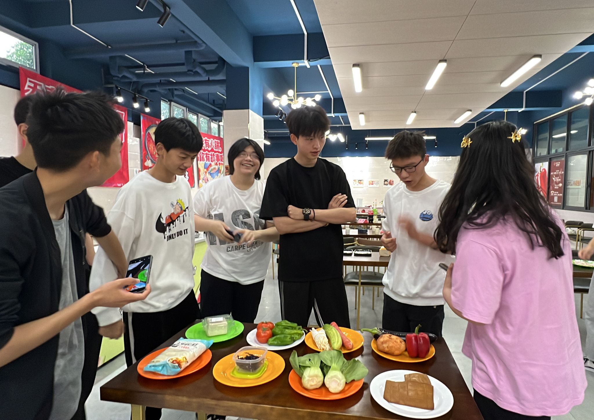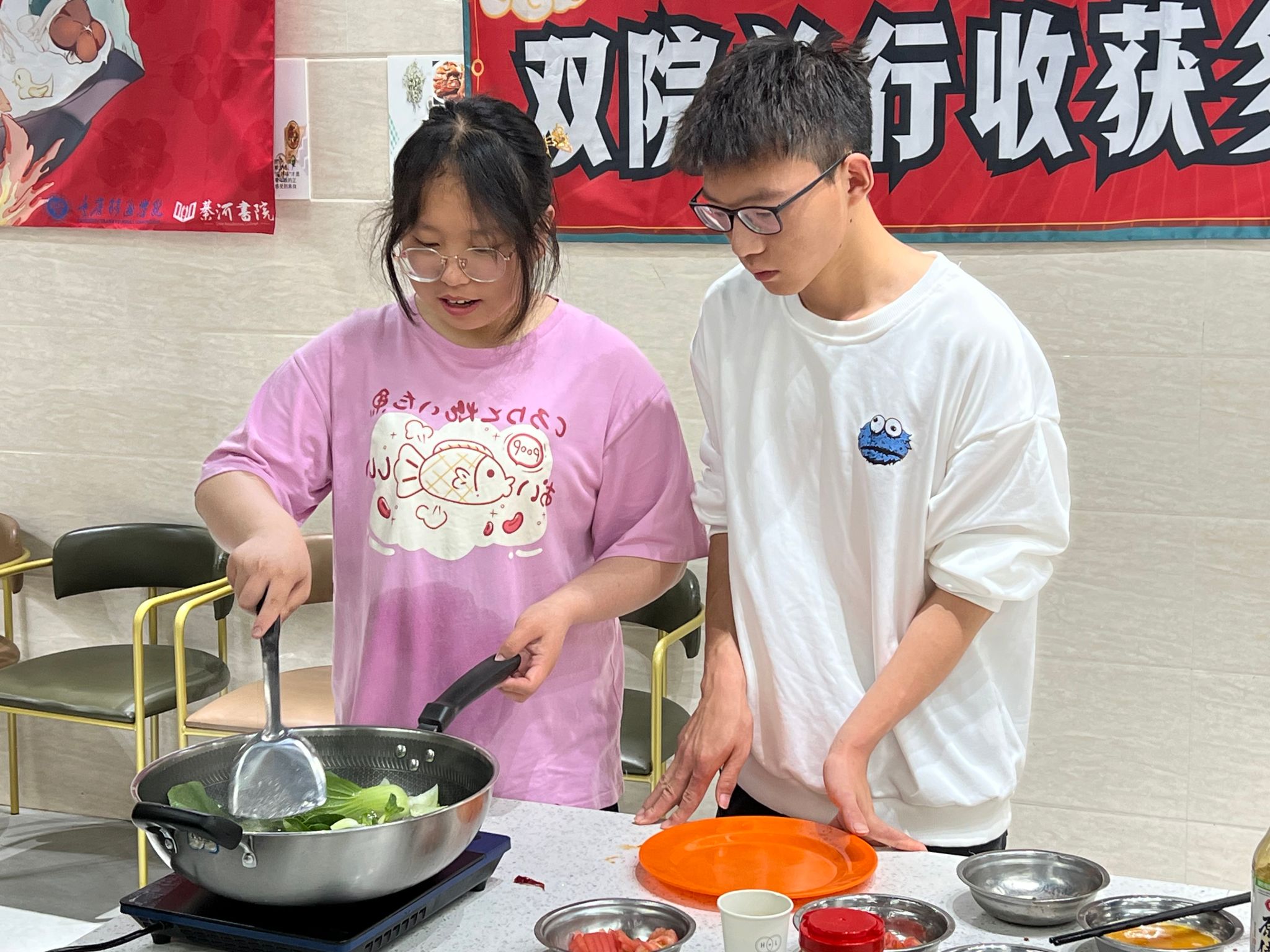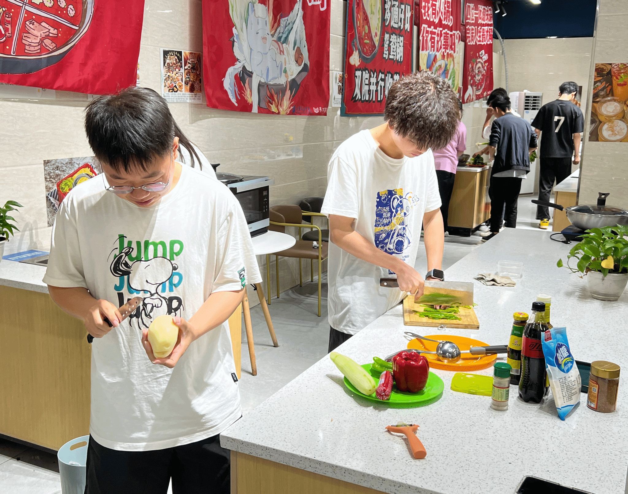 正式比赛开始后,共享厨房内响起锅碗瓢盆碰撞的金属声、清洗肉类蔬菜的水流声、食物遇见油的滋啦声,但更多充斥在整个房间的还是同学们的欢笑声。每个组都分工明确、有条不紊,一些同学展现着自己熟练的刀工,一些同学则自信地展现着锅中的翻炒技术,每组同学都为了能够赢得比赛而专注在自己的料理台上。