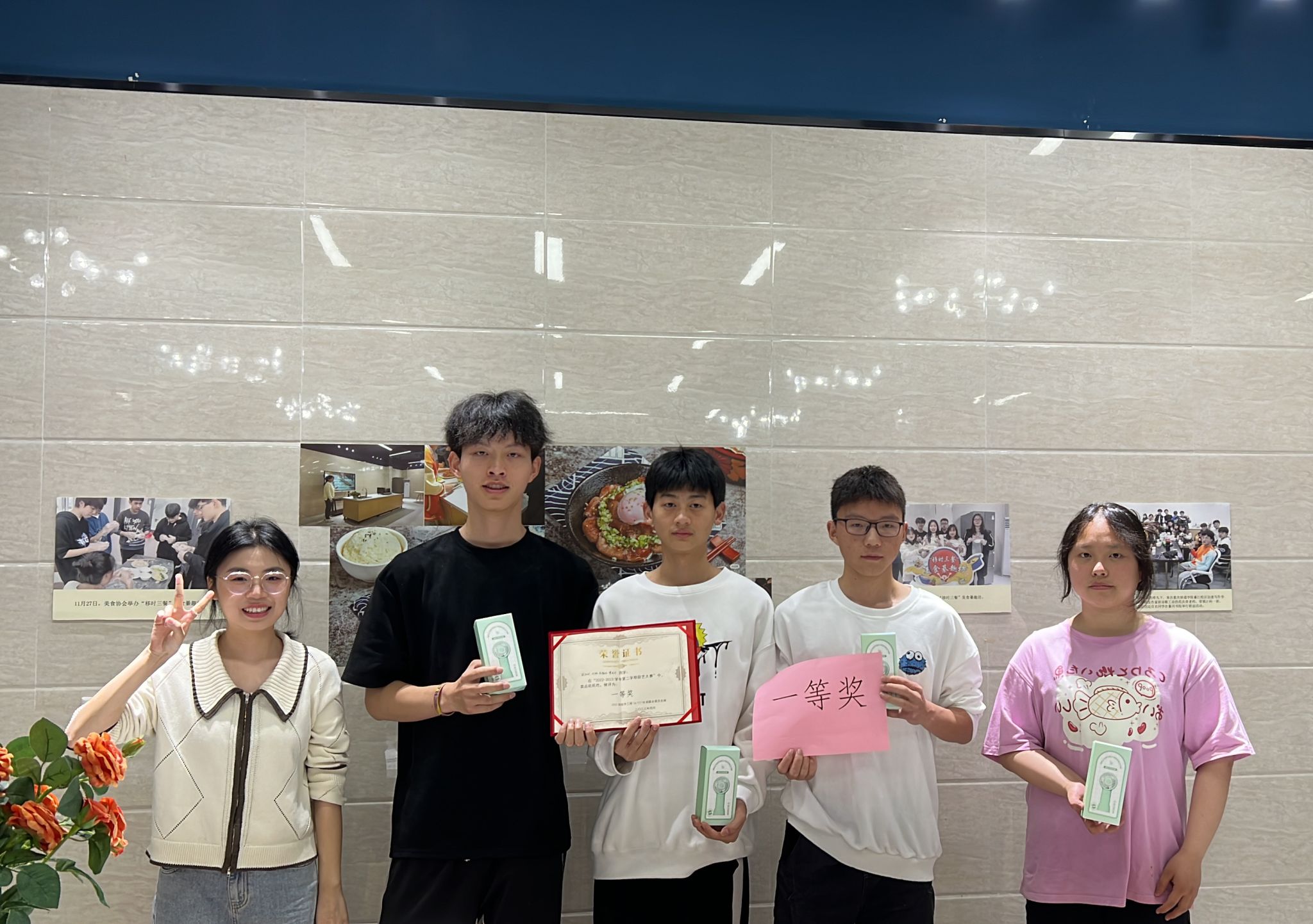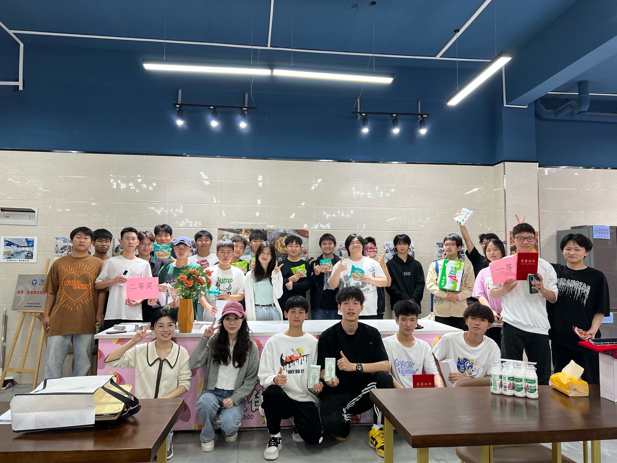 90分钟过的很快,三个组也都在规定时间内完成了他们的作品,共计15道菜。此时整个厨房已是美味飘香,在每组介绍完他们所制作的美食后,便轮到评委们点评和投票,作为一名评委,18班刘洪江同学表示很开心也很荣幸能尝到各位同学的好手艺,也从中学习了几道菜,希望五一回家后也能做给父母品尝。评委们把票压在了自己心仪的菜品下,朱老师和张老师计算出总分后,便进行了排名的公示及奖品的发放。获得一等奖的17班欧阳欢同学表示,很高兴能够参加这一次的厨艺大比拼并且拿到了一等奖,说是一次比赛倒不如说是一个促进同学友谊的活动,随机分组的方式也让自己也认识了新的同学,很感谢老师能够给我们每个同学展示自己厨艺的机会。