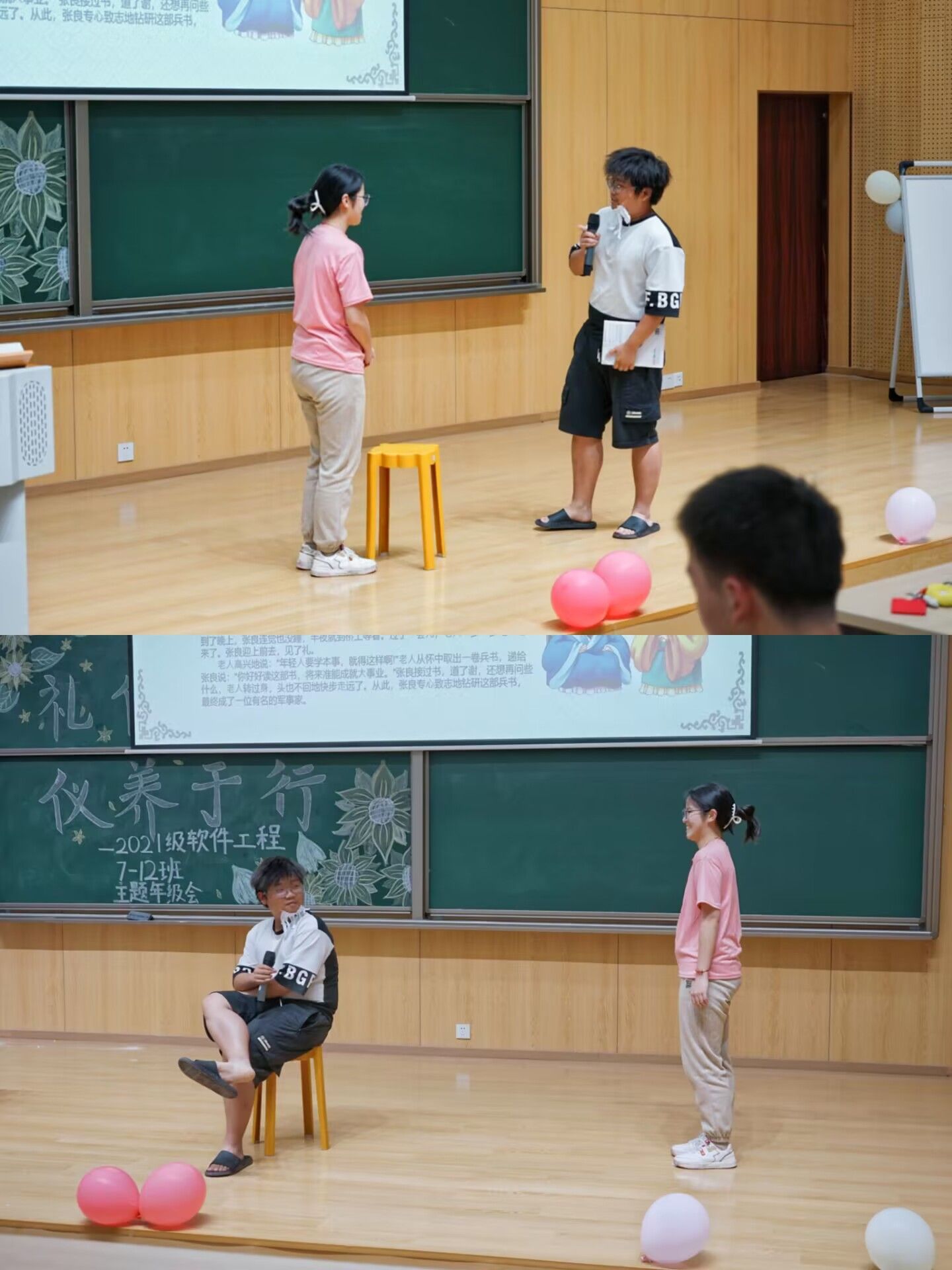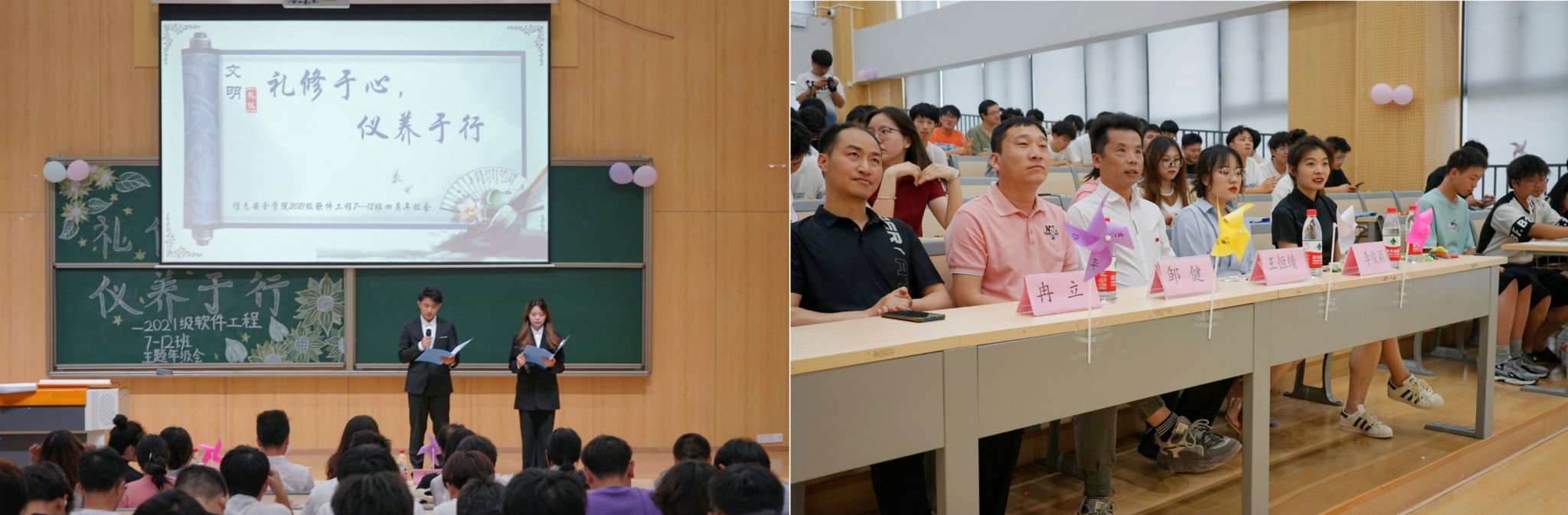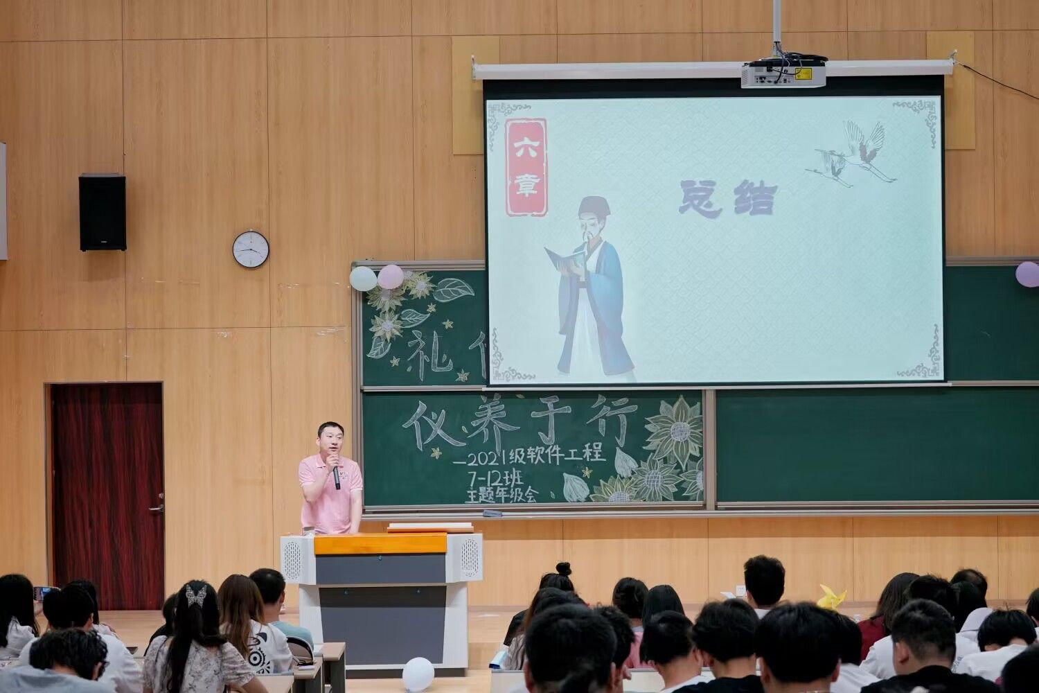 国尚礼则国昌,家尚礼则家大,身有礼则身修,心有礼则心泰。为了培养同学们的礼仪意识、营造学风优良,知书达理、待人以礼的良好氛围,2023年4月21日下午于玉棠书院 YT1111 阶梯教室, 2021级软件工程7-12班开展“礼修于心,仪养于行”主题年级会。在此次年级会中生动地诠释泱泱华夏,赫赫文明。仁风远播,大化周行的中华文化,让每个同学感受到了修礼、养仪的宗旨所在。