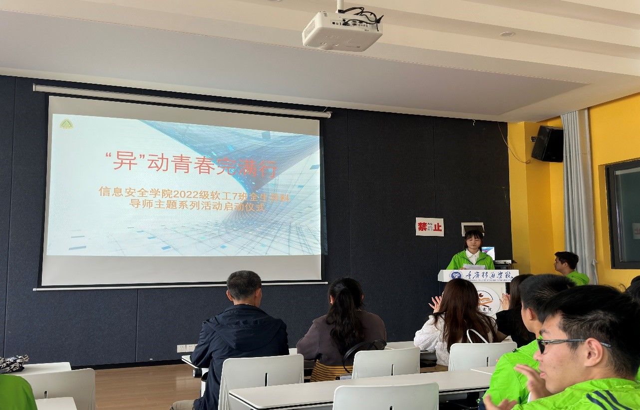 2023年4月26日下午15:00,2022级软件工程七班在瀛溪书院回声报告厅举行异科导师主题系列活动启动仪式,出席本次活动的老师有信息安全学院教研室主任郑慧娟老师、校团委社团活动版块指导老师杨佳燕老师、信息安全学院辅导员袁君老师。启动仪式旨在向同学们全面介绍异科导师主题系列活动的具体内容,并寄托老师对同学们的悉心关照与厚望。