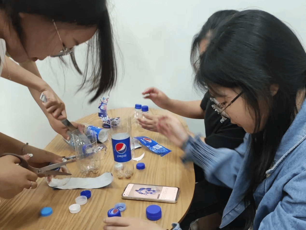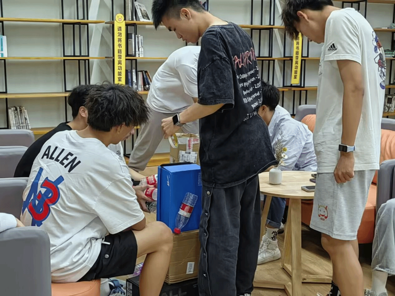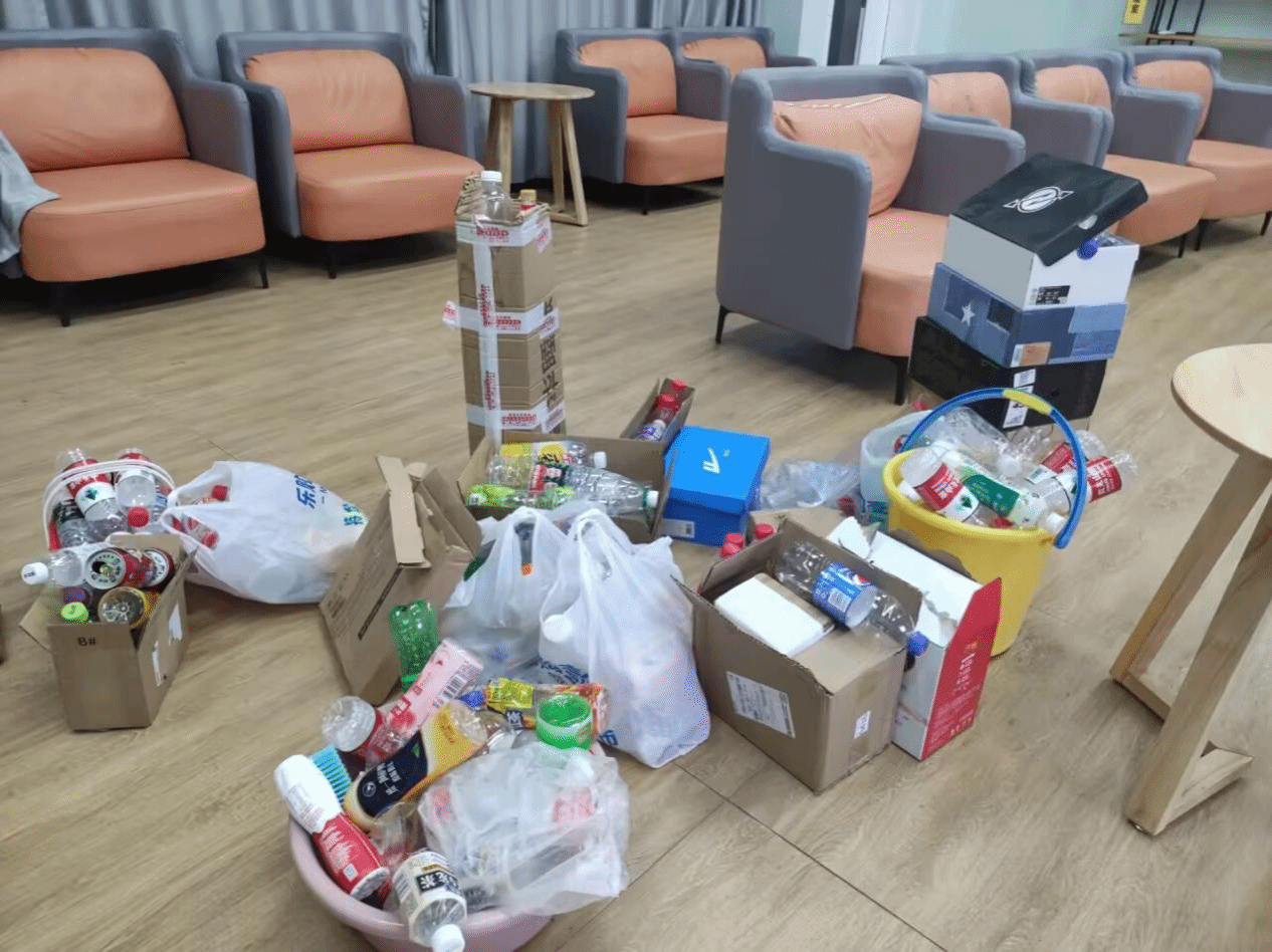 此次活动开展前,班委号召同学们将平时废弃的矿泉水瓶,纸箱,鞋盒等收集起来,增强同学们的环保意识,低碳生活。于2023年5月19日集中进行收集废旧物。用于制作新物品,深度挖掘塑料品,纸箱等废品的可持续利用性。到场的每个同学都满怀笑容,班委将同学分成四个小组,让每个小组成员充分发挥自己的想象力创造一个属于本小组的作品。