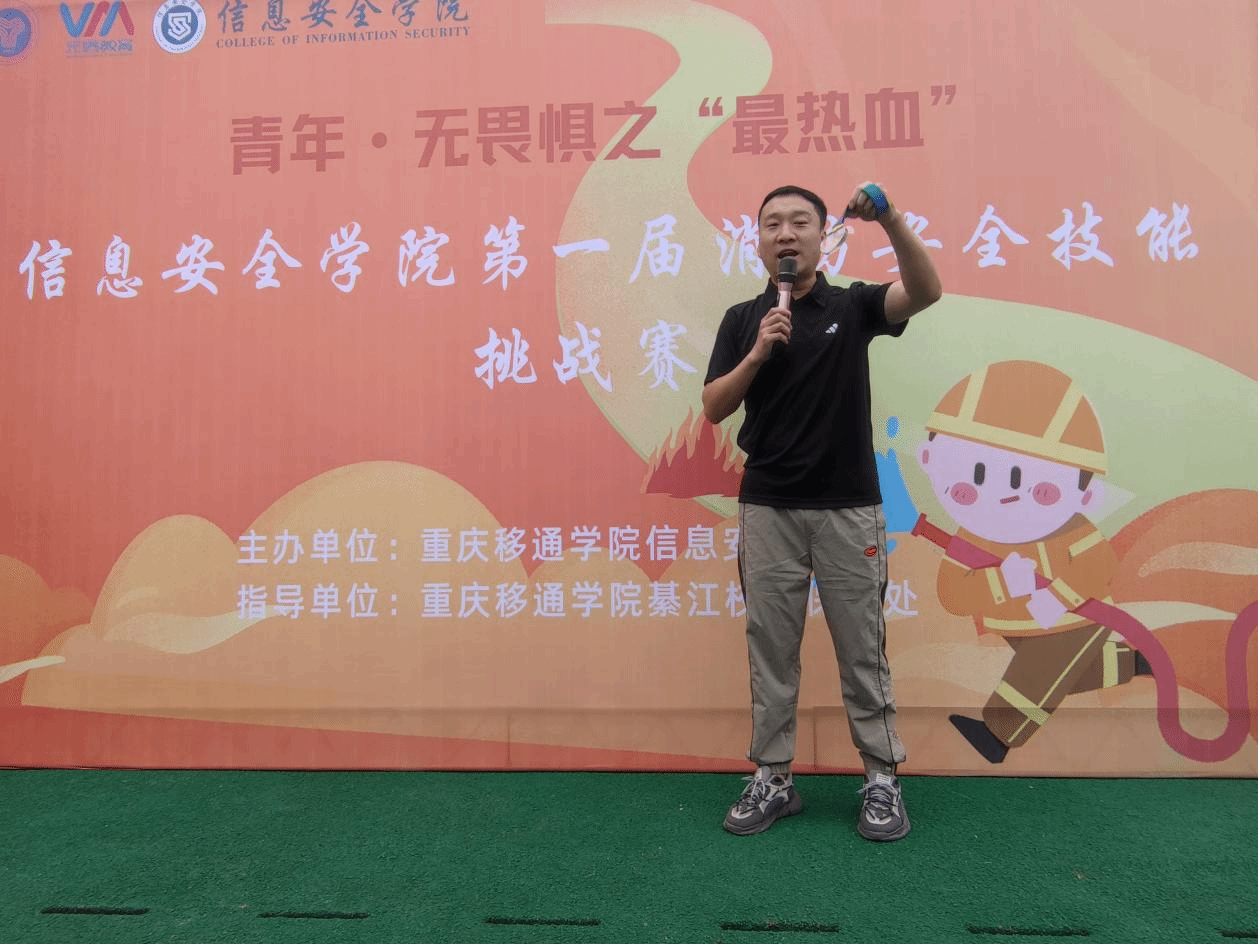 当日14:00,信息安全学院学生工作办公室主任邹健致开幕词,他表示:“5月,正值五四青年节,在校团委的指导下,在“五四青年品牌月”活动的号召下,信息安全学院积极承办“青年·无畏惧之最热血”子活动;5月,又遇“全国防灾减灾日”,信息安全学院多次和校区保卫处沟通及合作举办相关活动,用消防安全知识讲座、观摩消防支队及切身体验等方式,积极贯彻落实国家对防灾减灾工作的重要指示,以期进一步唤起学生对于防灾减灾工作的高度关注,增强防灾减灾意识,普及推广全民防灾减灾和避灾自救技能。二者融合成为本次挑战赛,希望同学们借此机会磨砺自己,争做有理想有本领有担当的新时代中国青年,用无所畏惧及满腔热血的态度积极参与其中,同时展望后期的校级消防安全竞赛,奋发向上,夺得好成绩。”