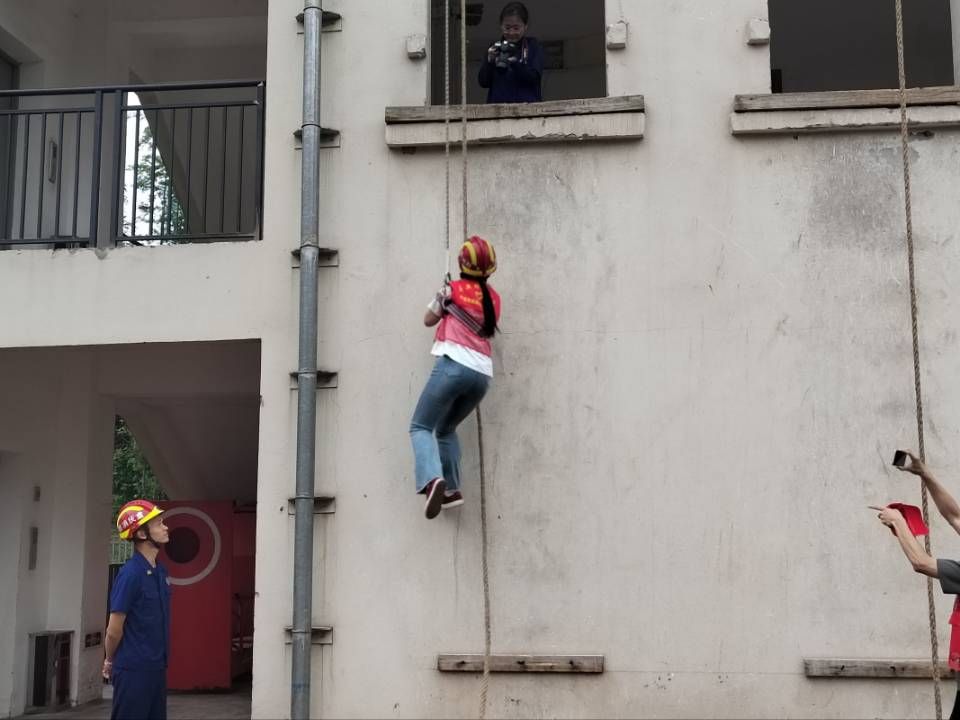 项目体验3——爬绳体验及绳索、绳结学习。当高耸的训练塔楼映照在师生眼前,在这里师生们克服恐惧,亲身体验于楼梯外利用爬绳上下楼,同时在消防队员的讲解中师生们了解到更多关于绳索的利用方式及绳结的制作方法。