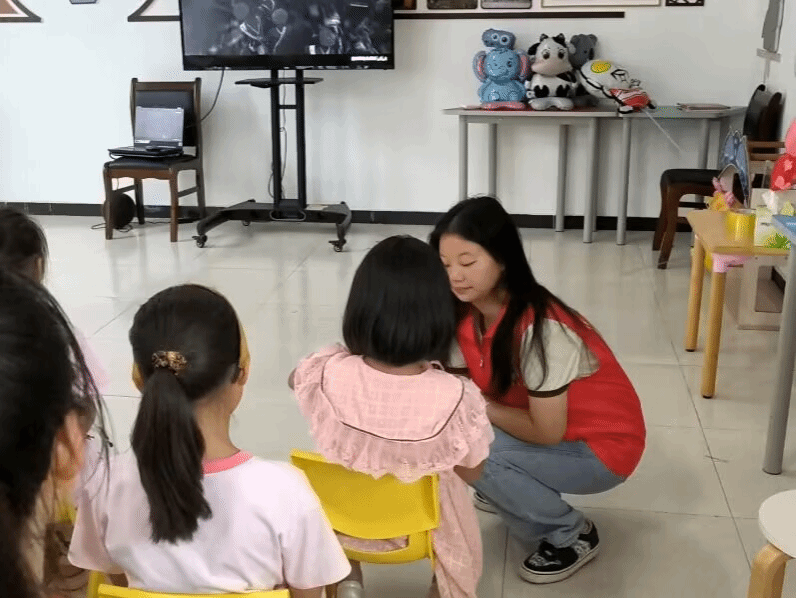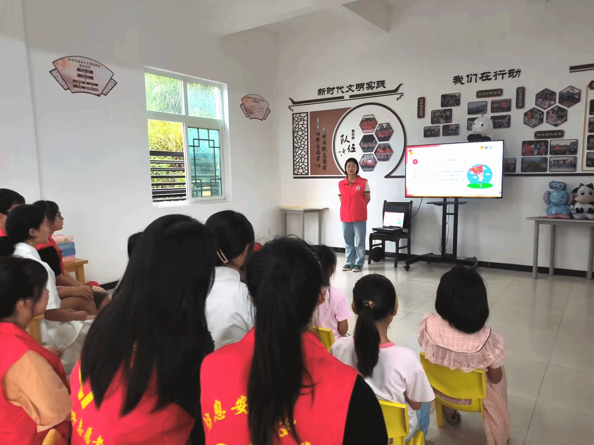 志愿者们来到中华村党群服务中心开展红色主题教育实践活动,弘扬红色文化和传承红色基因是将红色精神蕴含到故事里,所以讲解过程中志愿者采用PPT和视频结合的形式,重点落在了中国共产党的发展历程上,用小朋友更容易理解的方式绘声绘色的为小朋友们讲解英雄人物的故事,小朋友们都聚精会神的聆听着。