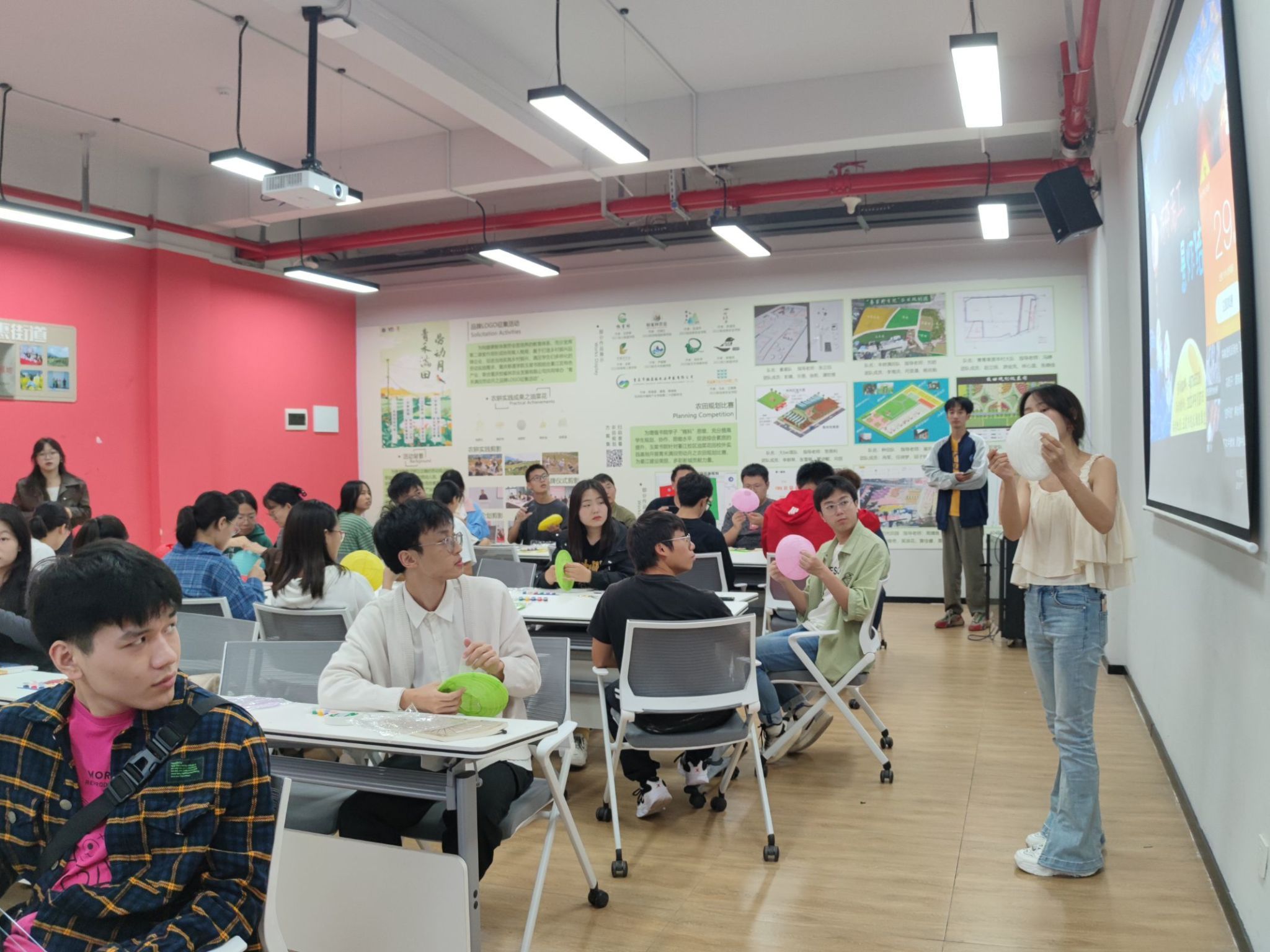 来到活动现场,50名同学们依次落座,秩序井然。工作人员在台上认真讲解我们的活动制作与流程。紧接着,同学们充分发挥创造力、想象力,如火如荼,大显身手。有的用笔描绘出精美的图案,有的写下贤人诗句,有的用笔勾勒出流畅的线条;制作出一盏盏独一无二的灯笼,创造属于中国人自己的浪漫。