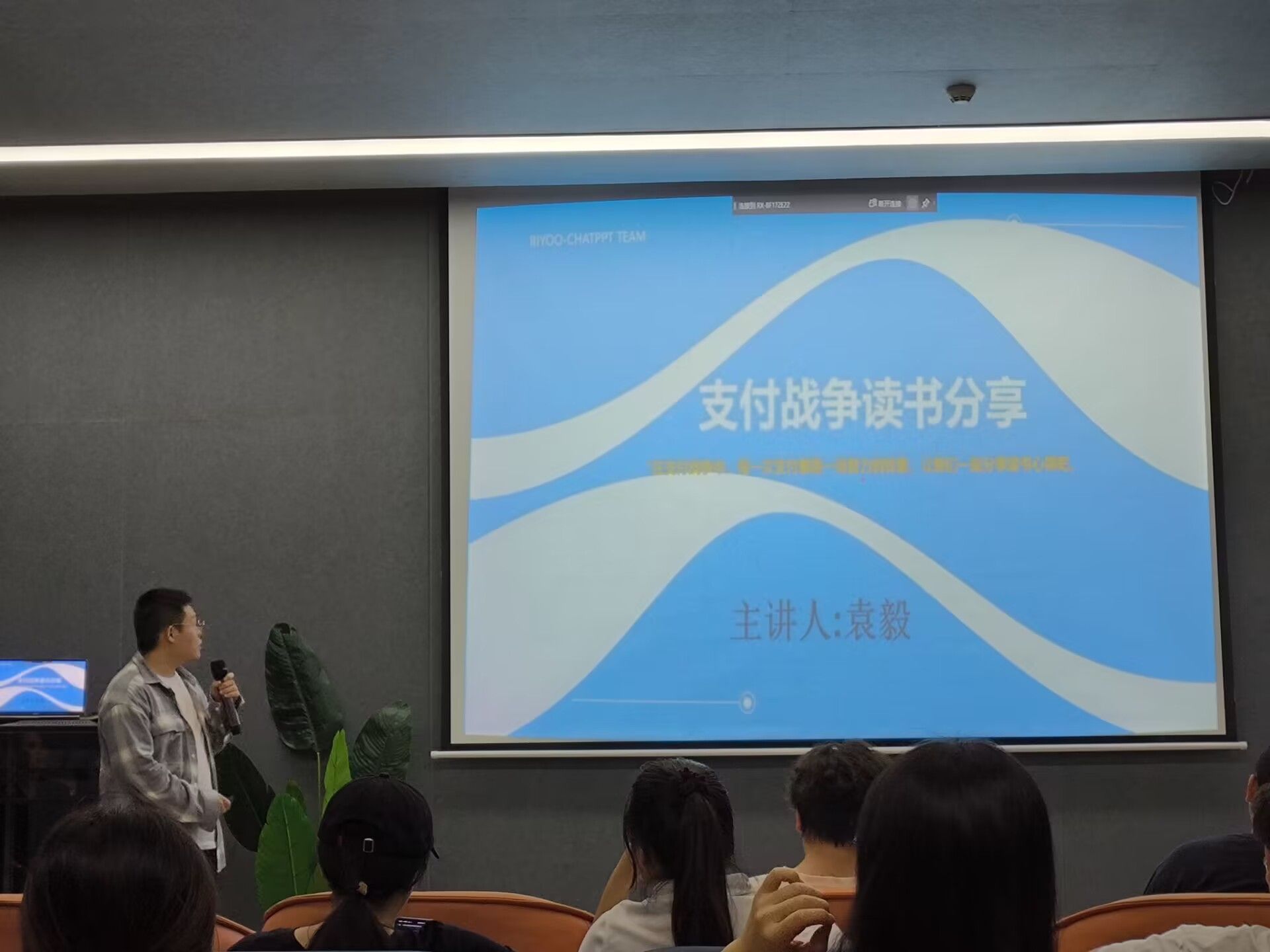 随后,袁毅同学进行了《支付战争》大咖阅读分享,随着移动互联网的发展,移动支付已成为全球范围内的主流支付方式,而中国内地的市场份额更是占据了全球市场的重要地位。他认为在支付战争中,每一次支付都是一场智力的较量,读此书非常有现实意义。他还介绍了数字支付市场的竞争主要集中在技术创新、用户获取、品牌建设和安全保障等方面。袁毅同学隆重推荐这本书,他认为此书通过生动的案例和深入的分析,让我们了解了支付系统的运作方式、技术和创新。无论你是对金融科技、跨境支付、电子支付等领域感兴趣,还是想深入了解支付系统的运作原理,这本书都会为你提供重要的知识框架。而且本书不仅关注支付系统的技术层面,还强调了其对社会和经济的影响,支付系统塑造着我们的日常生活和经济活动,阅读此书大有裨益。