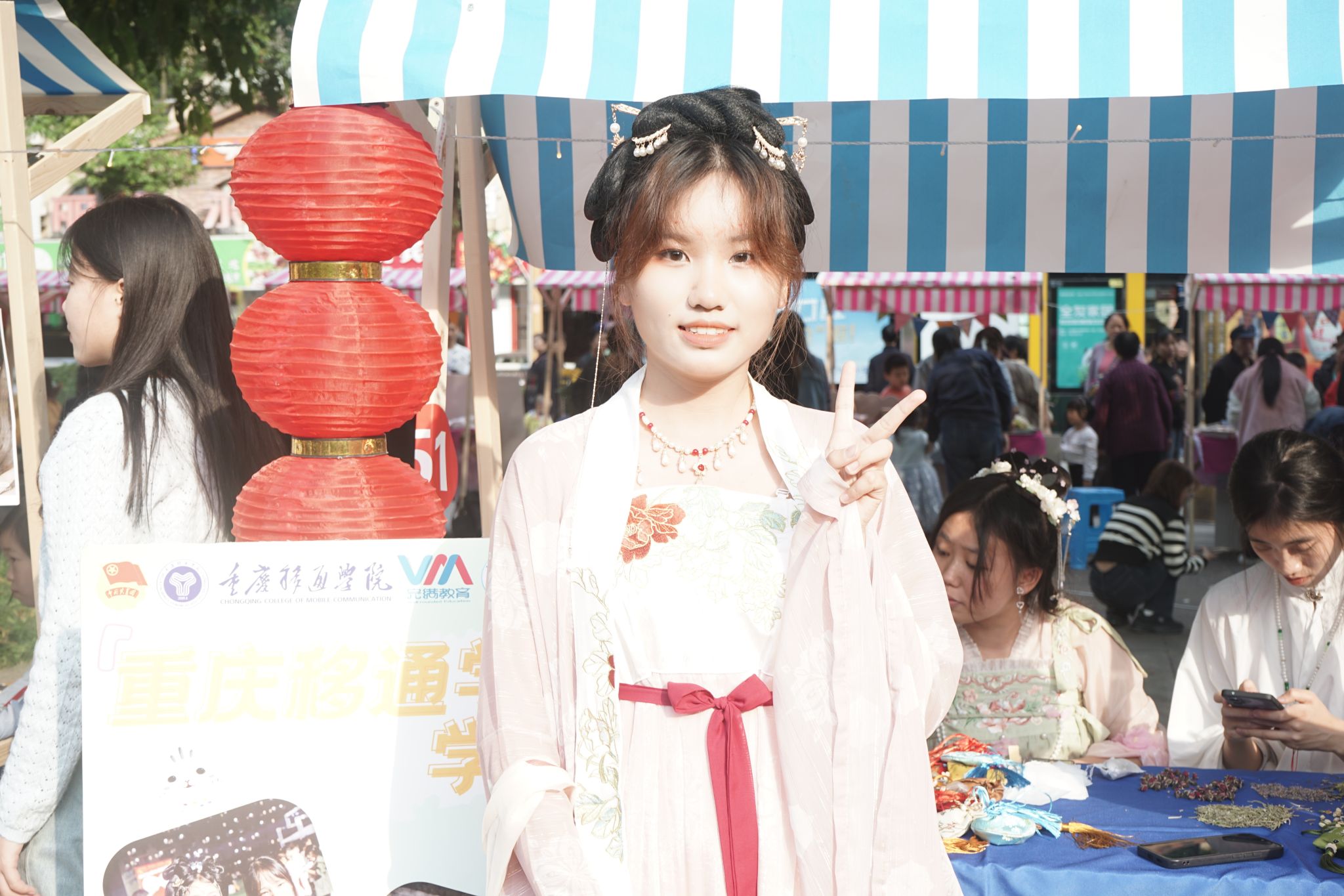 如若足够细心,你就会发现围绕沙溪河文化公园,正在进行汉服拍照、打卡体验,让人流连忘返。华韵汉服协会的同学身着汉服,头戴珠钗簪花,仿佛梦回秦汉王朝,风姿绰约,漂亮的妆造吸引了不少人前来围观。大家纷纷挑选其香料,时而拿在手中放在阳光下观察,时而送至鼻前轻嗅,最后将满意的香料送至香囊,制作完成后,他们也满心欢喜地拍照留念。