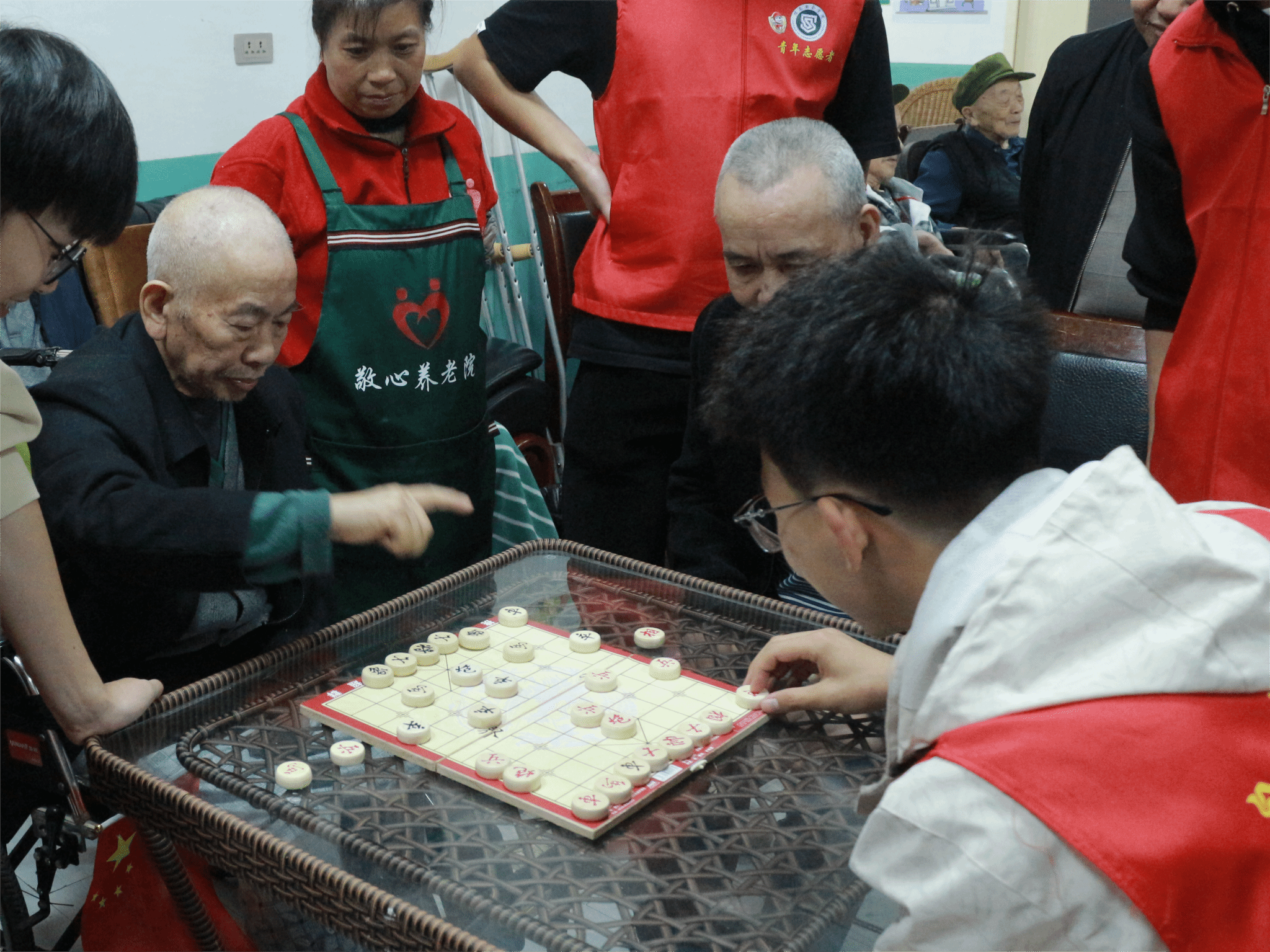 活动当天,志愿者带着慰问品水果、面包等,走进敬心养老院,对老年人们进行了探访和陪伴。在养老院中,志愿者亲切地与老年人们唠家常,询问他们的生活和健康状况,为他们表演文艺节目。观看节目时,老年人们在台下露出笑脸,欢呼鼓掌为志愿者们捧场。当志愿者合唱起《没有共产党就没有新中国》时,在场的所有老年人们挥舞着手中的红旗,加入到大合唱中。几位爷爷奶奶内心重燃热血,在大合唱结束后,主动提议为大家独唱了几首歌曲,例如吴奶奶带来的《綦江,綦江》以此来表达对志愿者的欢迎。志愿者也更加热情,有的为老年人按摩,有的与爷爷们下象棋,有的参观老年人们的卧室并与其聊天,志愿者将志愿服务的意义诠释的淋漓极致。