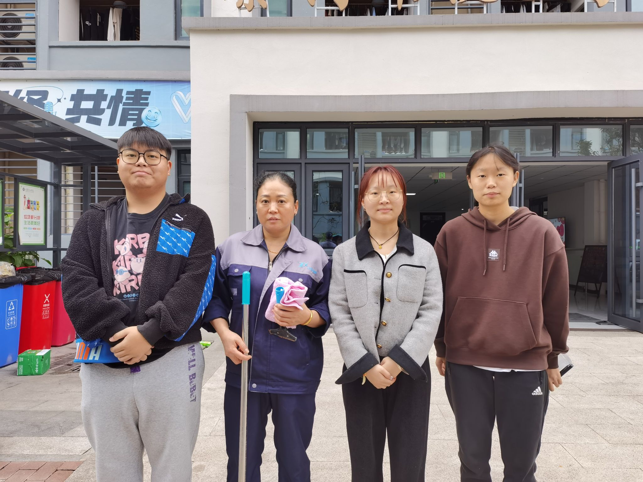 讨论结束后,参与者以小组为单位给环卫工人赠送礼物。各个小组到校内寻找清洁工,向他们说明来意后,热心询问他们的最近的身体状况,工作的范围,并将礼物送达到他们手里,收到礼物的环卫工人们非常惊喜与感动。在这个寒冷的秋日,同学们为环卫工人带去一丝温暖。所有人怀揣着感恩之情将礼物送去,用行动与话语表达着对环卫工人不辞劳苦清洁校园的感谢。