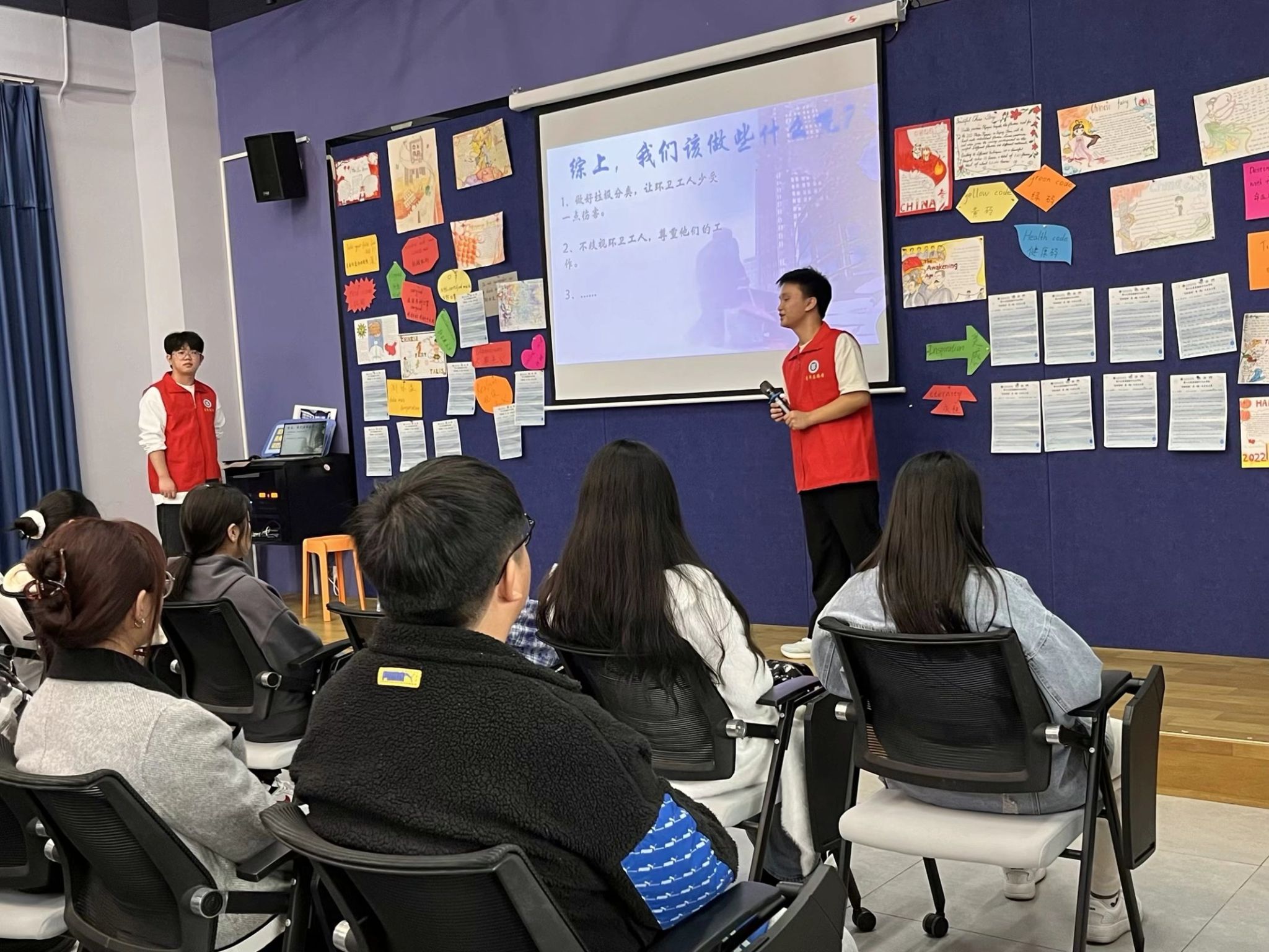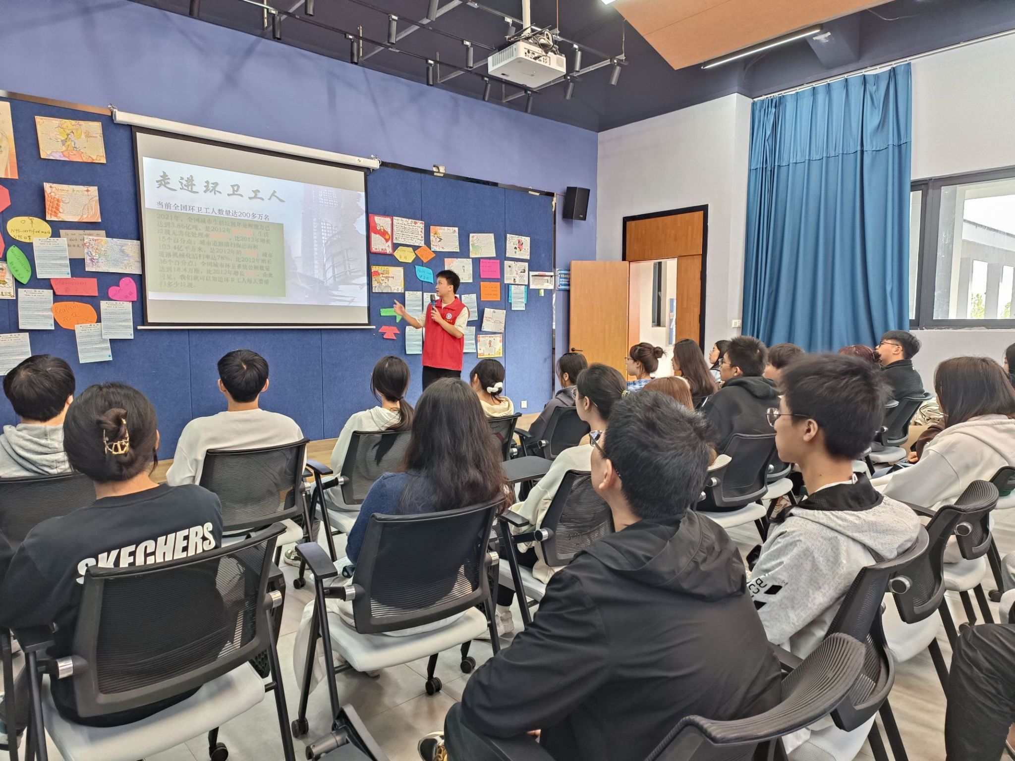 宣讲过程中,每个同学都在认真的思考减轻环卫工人的工作压力和改变当今社会上的一些职业歧视的方法。宣讲结束后,主持人邀请同学们上台发表自己的意见和看法,大家都积极参与其中。
