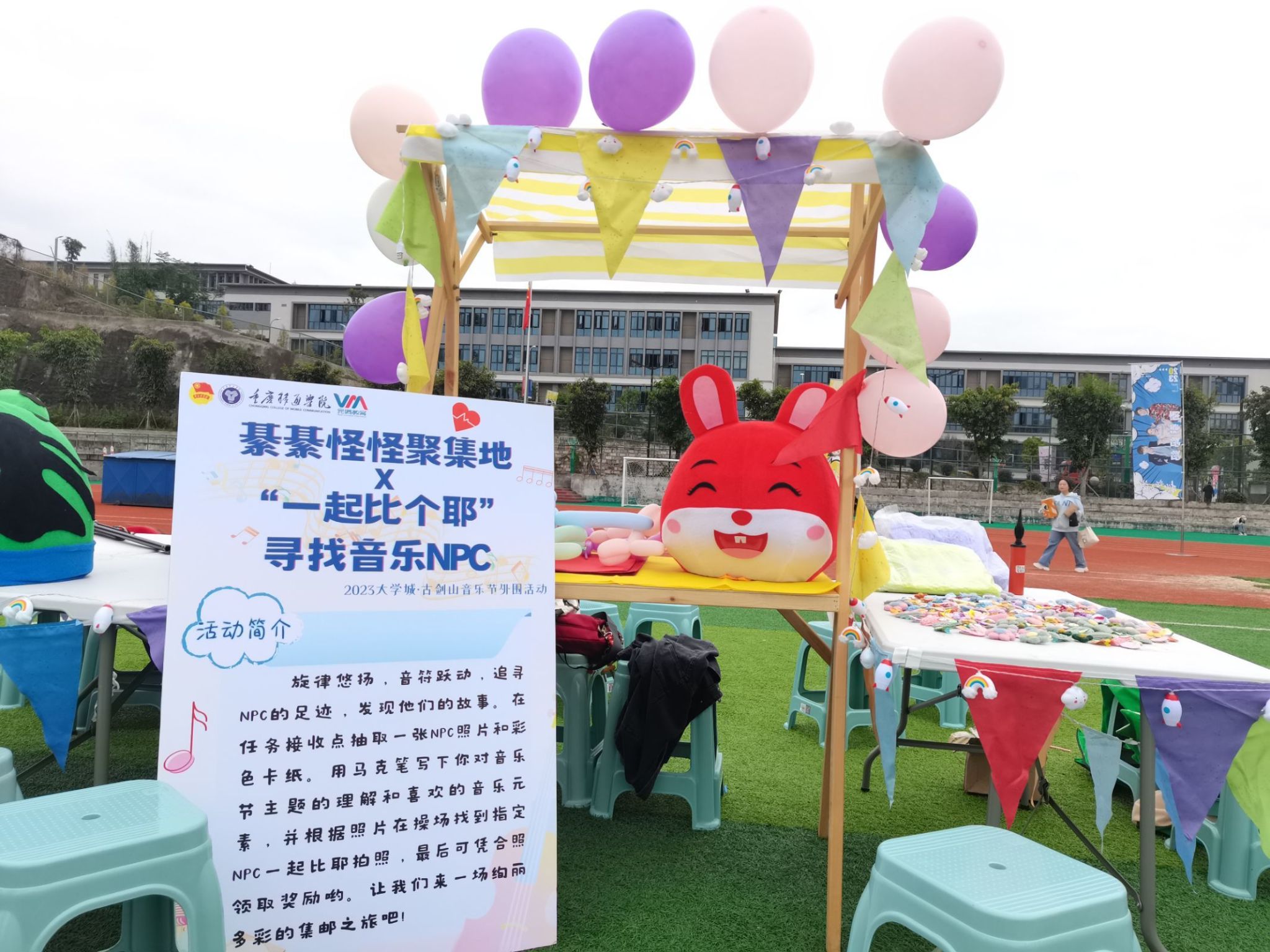 2023年 “古剑山·国际音乐节”正式拉开帷幕,为了丰富本次音乐节的活动形式,让学生能够热爱音乐、释放压力、享受生活,在移通可以释放热情,挥洒青春,把对未来美好大学生活的寄托藏进欢声笑语中。2023年10月28日-10月29日下午14:00,信息安全学院学生会文艺部在足球场开展——綦綦怪怪聚集地“一起比个耶”寻找音乐NPC音乐节外围活动。