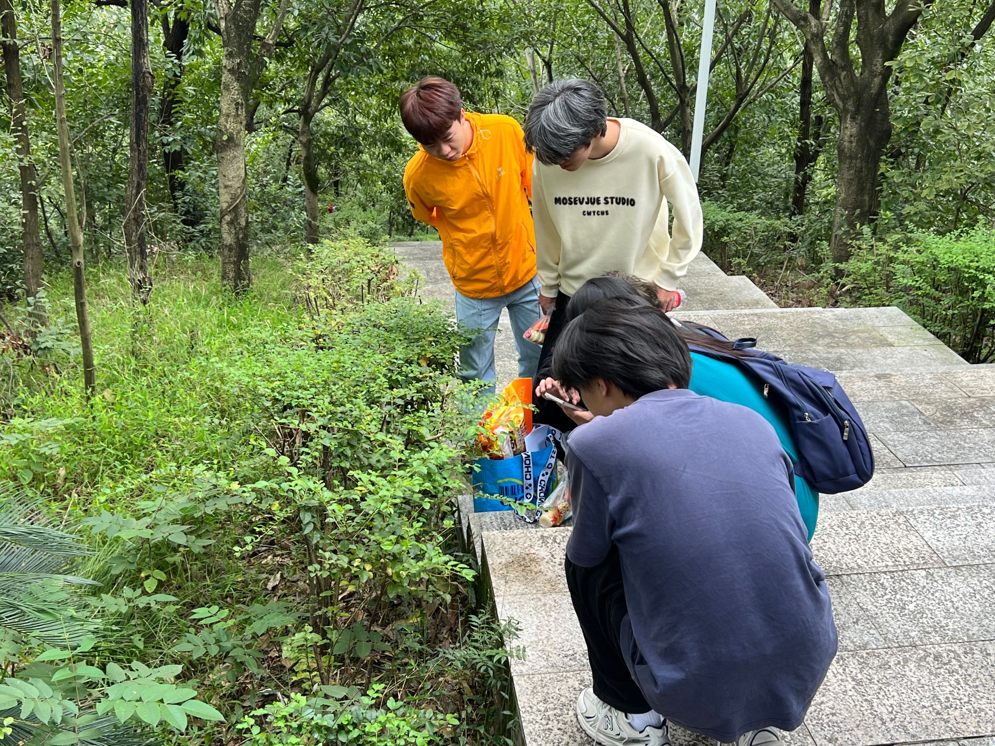为了让学生全身心感受大自然的魅力,在登山开始前朱老师将12位同学分成了3组,任务是用手机去拍摄沿途发现的动、植物,在到达山顶后数量最多的一组获胜。同时为增进同学间友谊及登山趣味性,朱老师为大家准备了“天使--宝贝”游戏,每位同学都是“天使”,需抽取在整个登山活动中自己守护的“宝贝”(同学),并且需要在不暴露身份的情况下完成纸条上对应的任务。