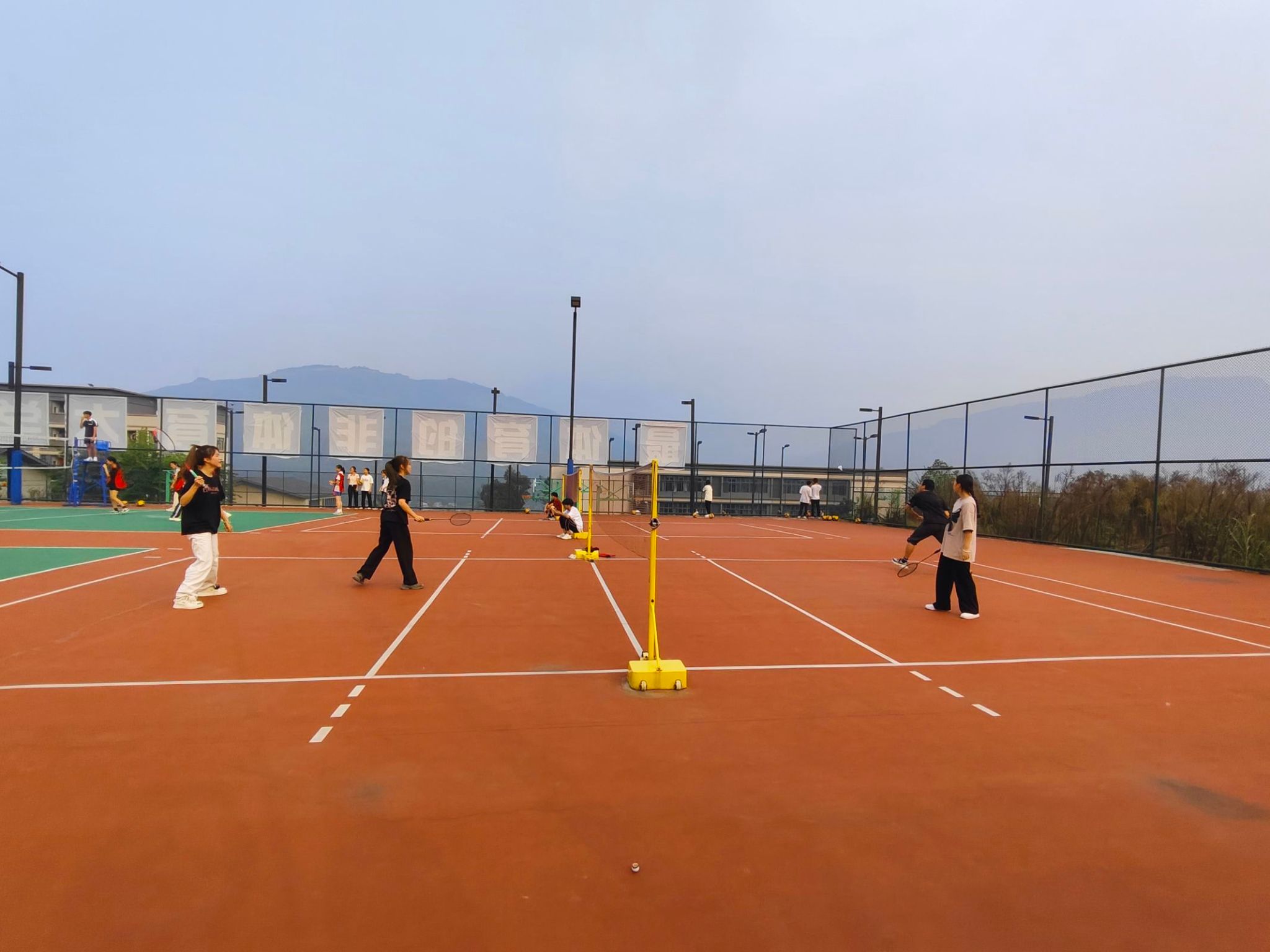 与此同时羽毛球场上,女生们比赛进行的热火朝天,丝毫不熟男儿。矫健地挥动着羽毛球拍,球来球往之间展现出她们的灵活与技巧。她们的身形迅捷而优雅,如同舞台上的精灵,有着女生独有的柔韧与气质,但是每一次回球都充满了力量和耐力。
