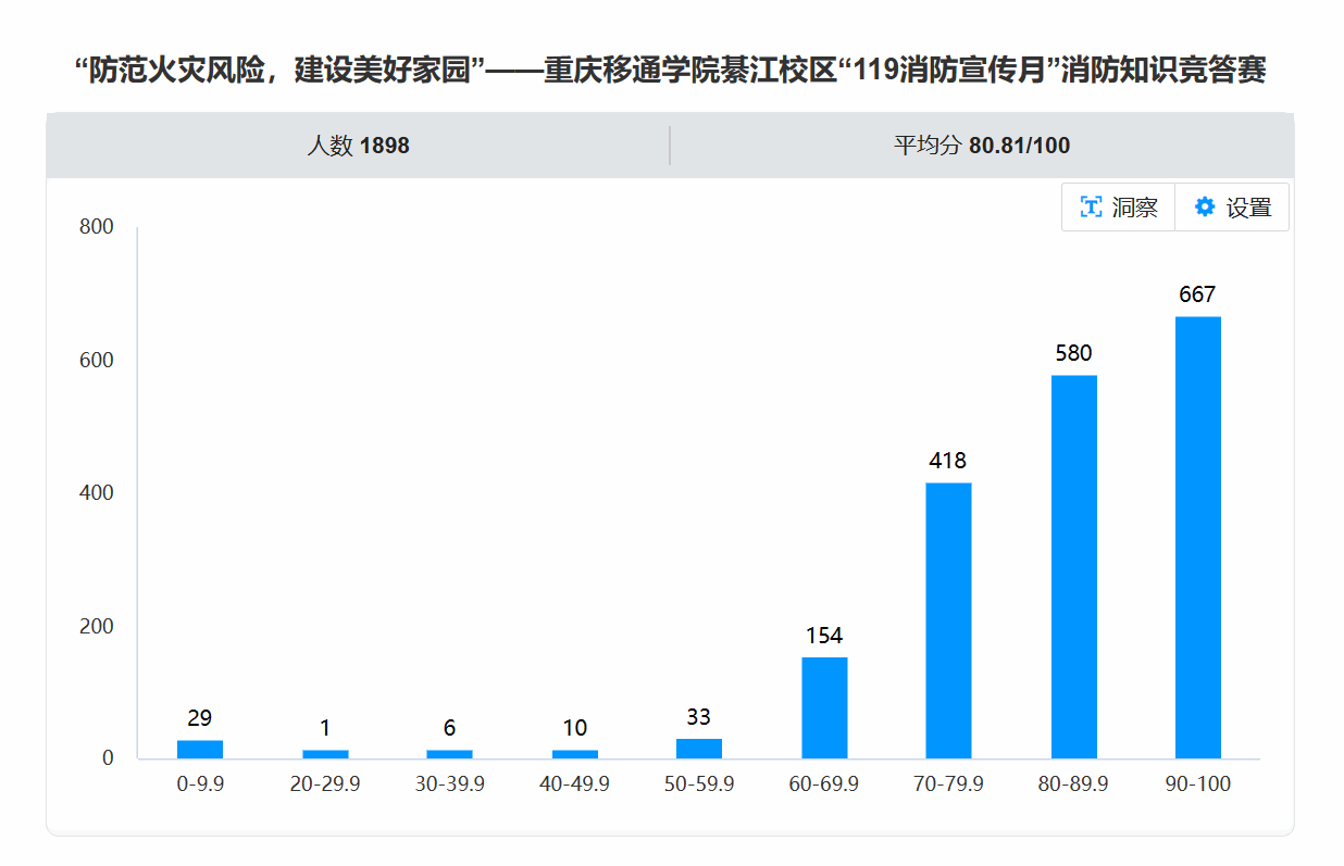通过消防知识竞赛的数据显示与分析,参与本次知识竞赛的总人数达一千八百余人,浏览量达三千余人。这些参赛者都有着充足的消防知识储备,满分者有近12%,80分以上的学生有近65%,60分以上者近96%,通过消防知识竞赛的举行,进一步强化了消防知识的科普、警示教育和提示宣传。同时也让学生们深刻地认识到了消防安全知识的重要性和必要性,也能启迪学生们的消防安全思维。