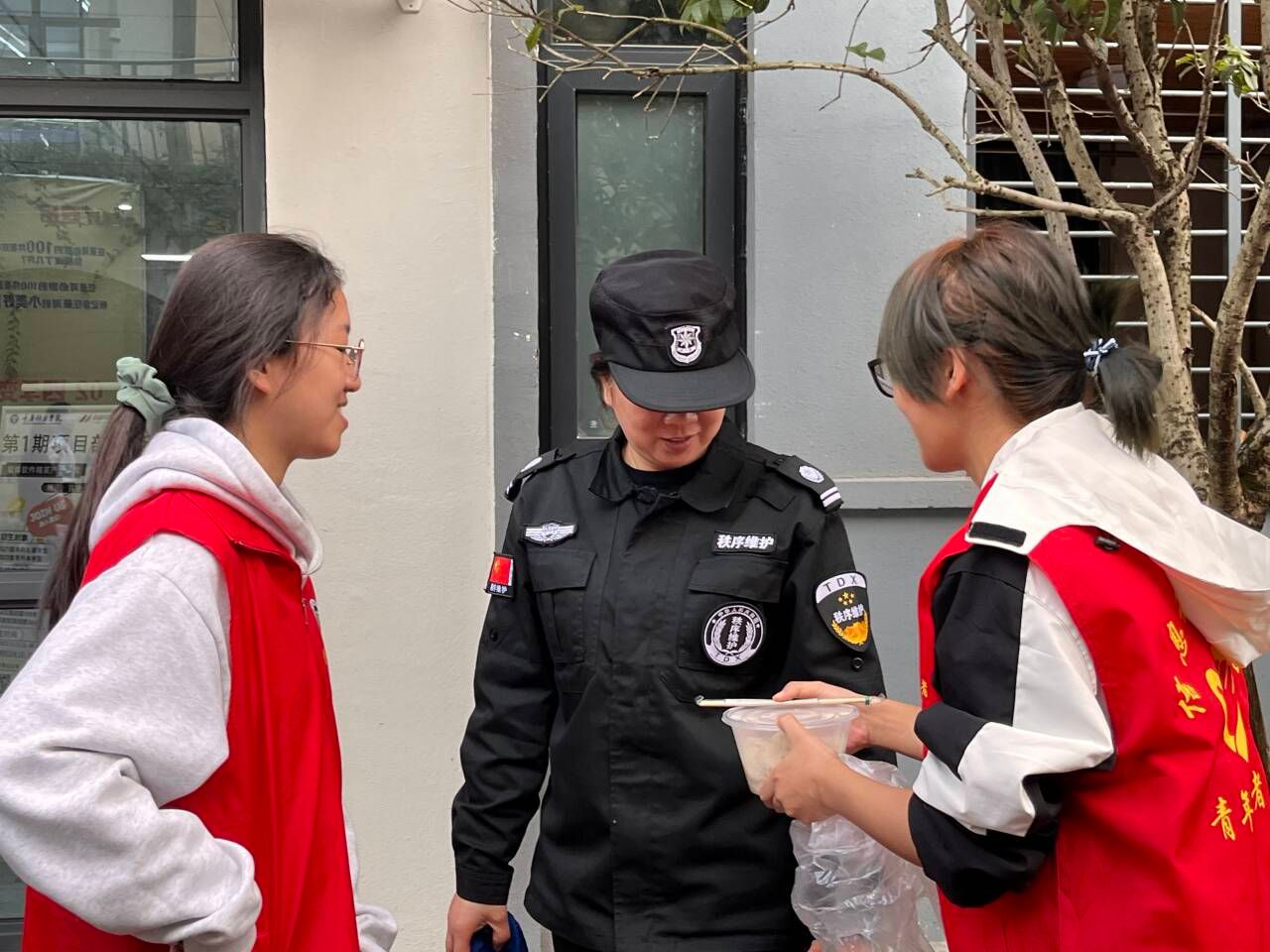 保安叔叔,宿管阿姨,保洁阿姨以及各位老师的身影在校园中时常可见,他们坚守在岗位上,维持着我们正常生活的进行。他们如冬日暖阳一般,给我们带来温暖和关爱,我们也要给予他们温暖。当热腾腾的饺子被送到工作人员手中,工作人员们的脸上都洋溢着笑容,他们脸上的笑意也绽开在立冬,夸赞道:“这个饺子味道闻着真香,今天可得多吃几个!”志愿者也说道“看到工作人员们今天这么开心,心里美滋滋的,所有的辛苦都值得了!”在与工作人员交流时,从不同的视角认识了学校,更好的了解学校。最后志愿者与工作人员们一起合影,记录下这美好的一幕。
