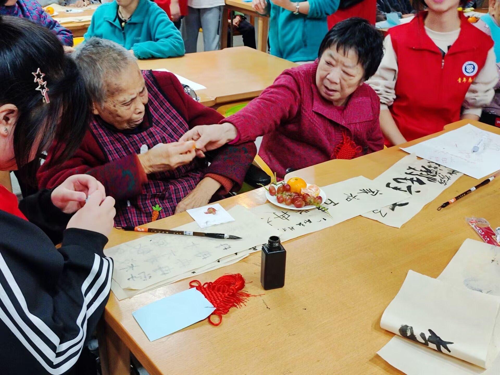 活动中,志愿者为老人们带去水果面包,宣纸和毛笔,热情地帮他们清洗水果,并教他们用毛笔画画、写汉字,画面十分温馨。志愿者还准备了手势舞,他们一边唱一边挥动着手臂,带动老人们一起加入其中,一起感受欢乐。