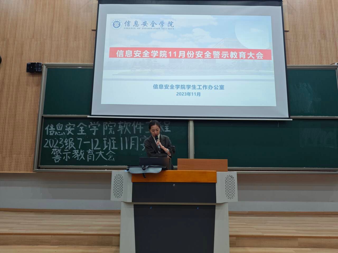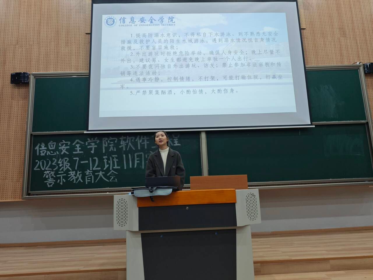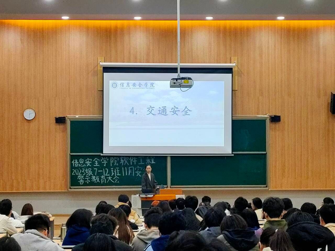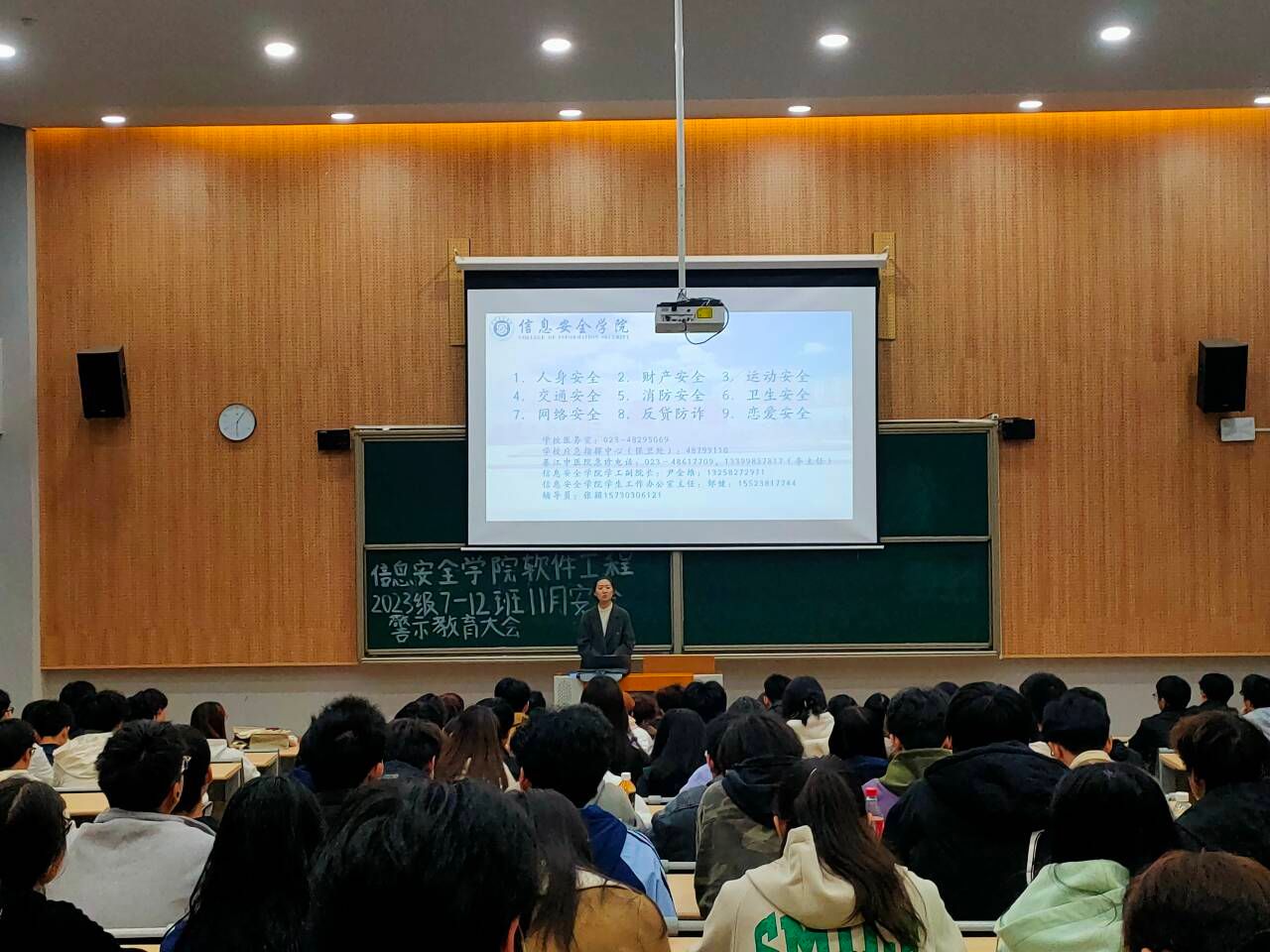 学生安全意识淡薄,在生活和学习中马虎、凑合、不在乎,把安全制度抛之脑后,导致事故、悲剧、意外屡屡发生。为增强学生们的安全意识和自我保护意识,2023年11月14日晚6点,信息安全学院软件工程2023级7-12班全体学生在张颖辅导员的组织下于横山阶梯教室开展了信息安全学院11月安全警示教育大会,帮助学生们增强安全意识,学习防范措施。