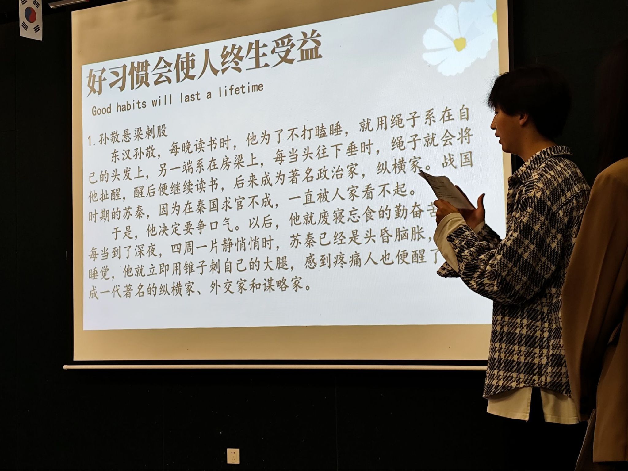 在行为习惯上,主持人为同学们举了著名文学家托尔斯泰的例子并强调“少若如天性,习惯成自然”。良好的习惯是个人成功的基石。在学习中,它帮助人塑造出刻苦努力、有毅力的品质,而在生活中,它有助于我们形成积极向上、健康有序的生活方式。
