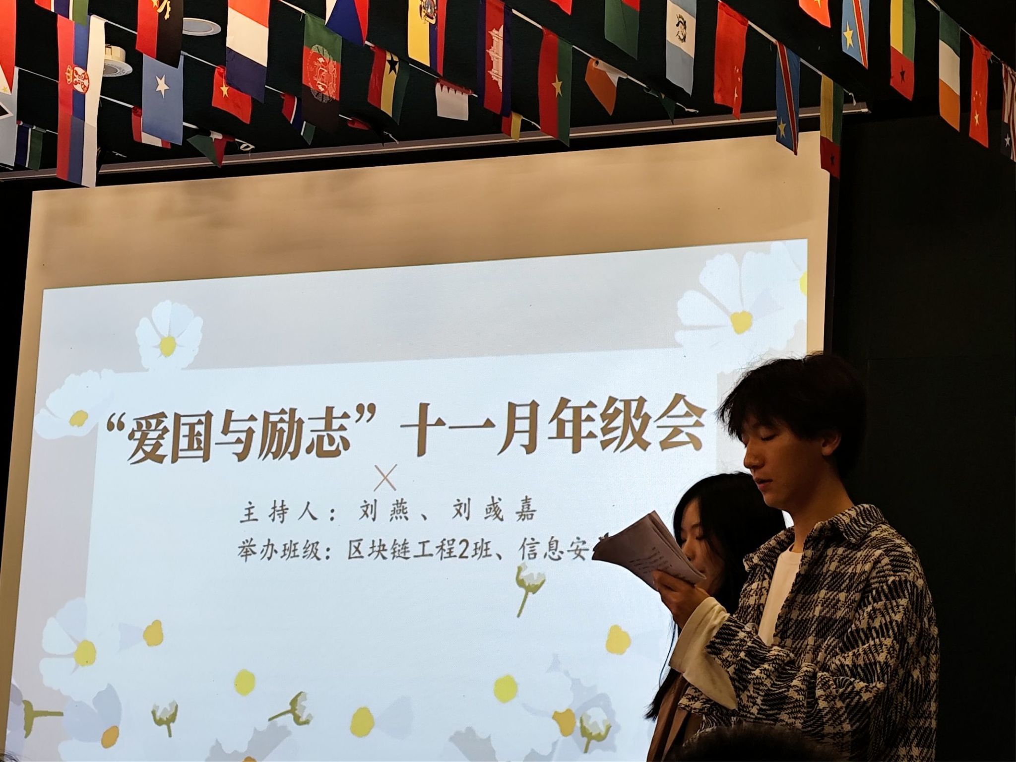 2023年11月10日星期五信息安全学院信息安全1-4班和区块链工程1-2班于横山书院流光影视厅成功举办了“奋进新时代,青春献祖国”十一月年级会,本次活动由信息安全3班和区块链工程2班班团委共同策划与准备。此次年级会旨在增进团队成员之间的感情,促进班级凝聚力和团队合作精神,激励同学们不断学习新知识、掌握新技能,适应新时代的发展需求,为社会建设和发展贡献自己的力量。