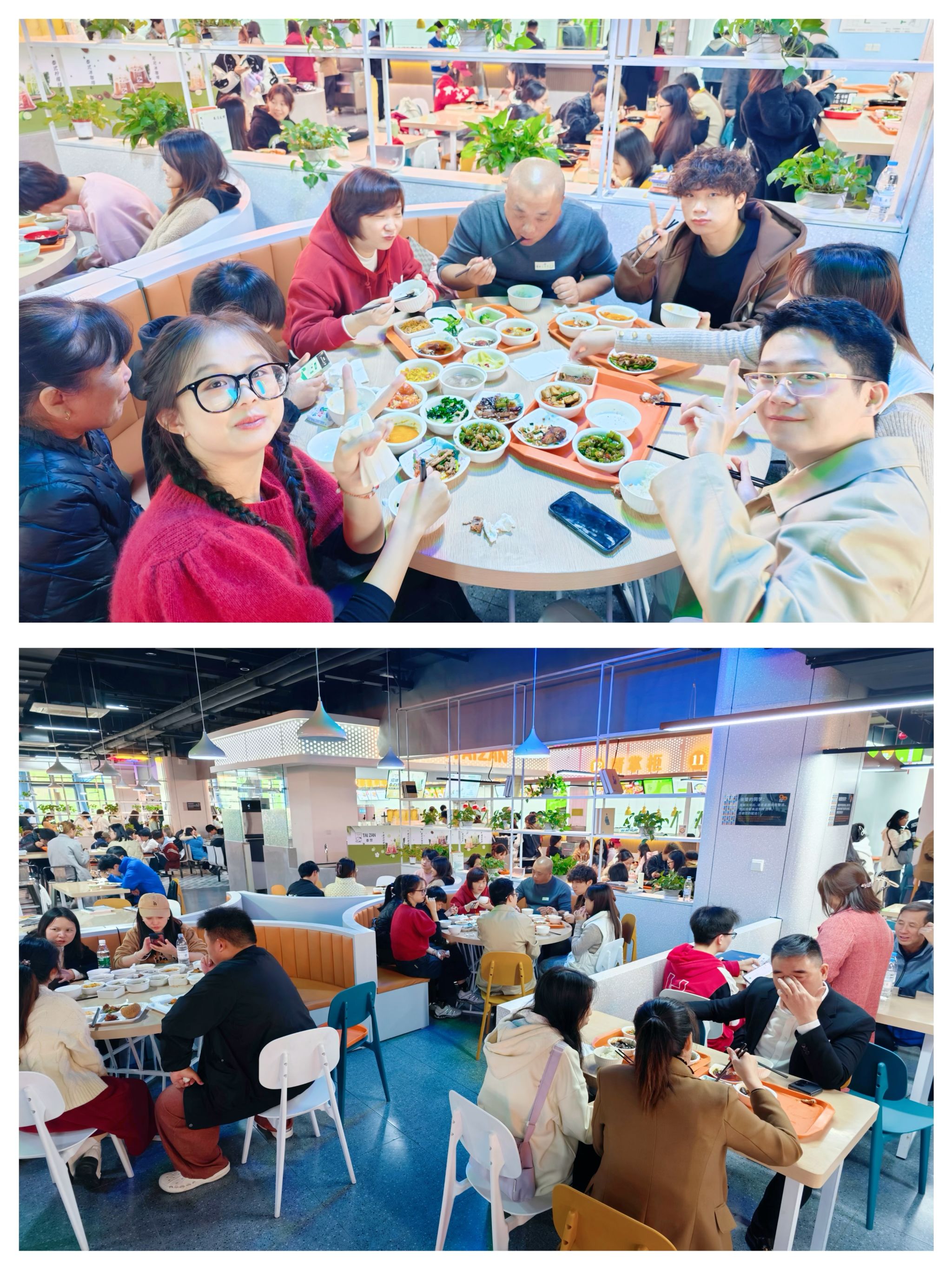 12:00,为让家长以轻松自由的方式体验学校食堂环境、学生日常饮食品类、安全卫生及消费情况,辅导员老师们带领着家长和学生在东溪食堂和北渡食堂就餐。“学校的菜品种类很丰富,饭菜也很好吃,非常不错……”家长们对学校的就餐环境表示充分肯定。餐桌上,笑声不断,一股温馨的气氛洋溢全场,充满欢乐。