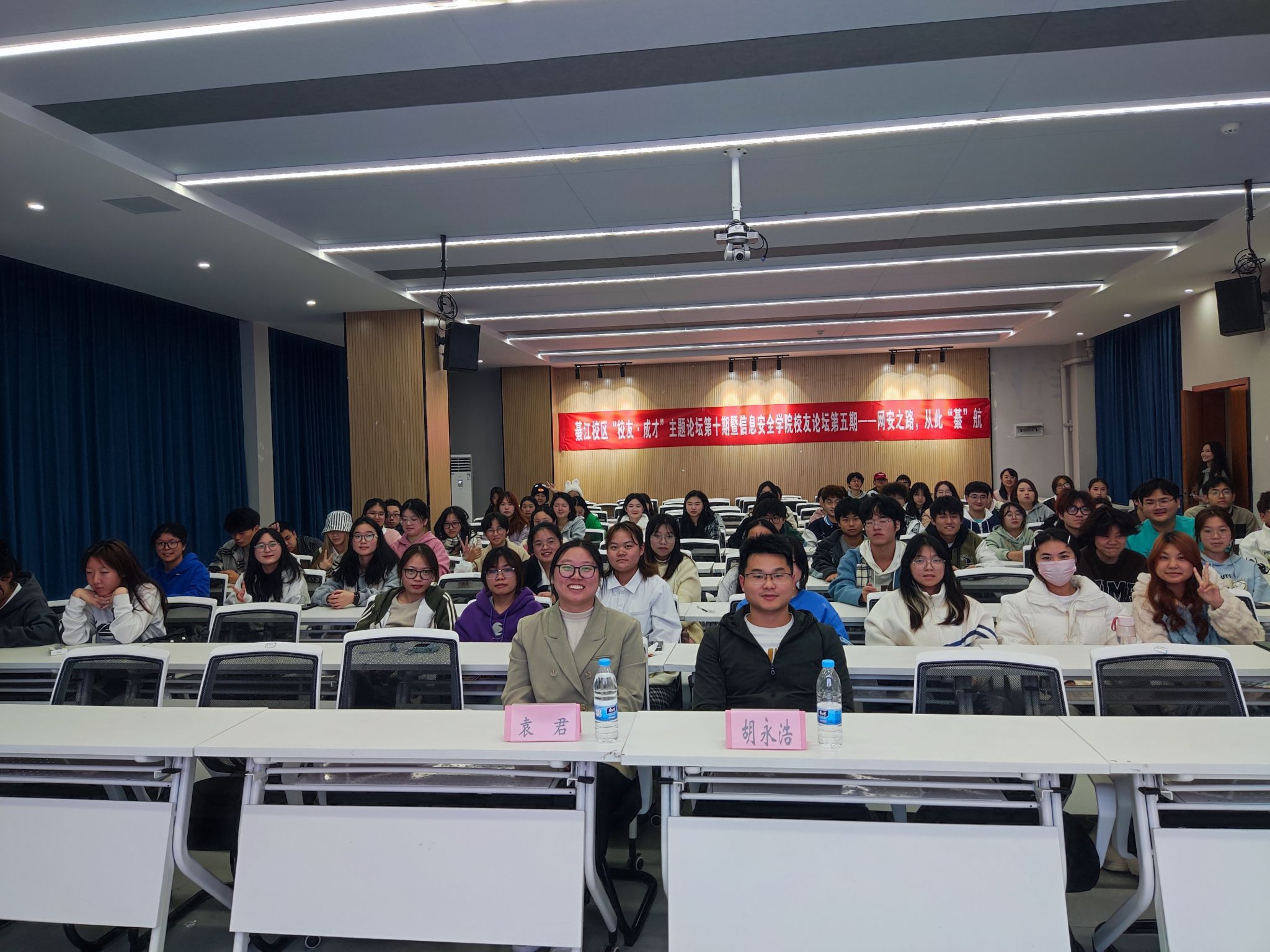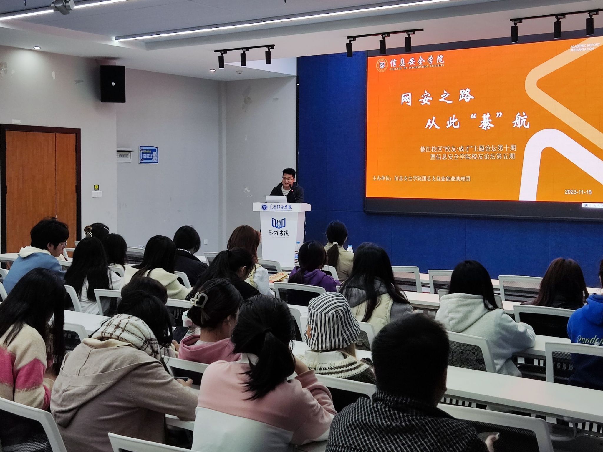 信息安全学院团总支就业创业助理团于2023年11月18日14:00在綦河书院2号楼观涛·多功能报告厅开展网安之路,从此“綦”航——綦江校区“校友·成才”主题论坛第十期暨信息安全学院“校友·面对面”第五期活动,本次论坛特邀嘉宾为顶尖安全公司的安全攻防工程师胡永浩,吸引了90名学生的热情参与,由吴治宏主持。