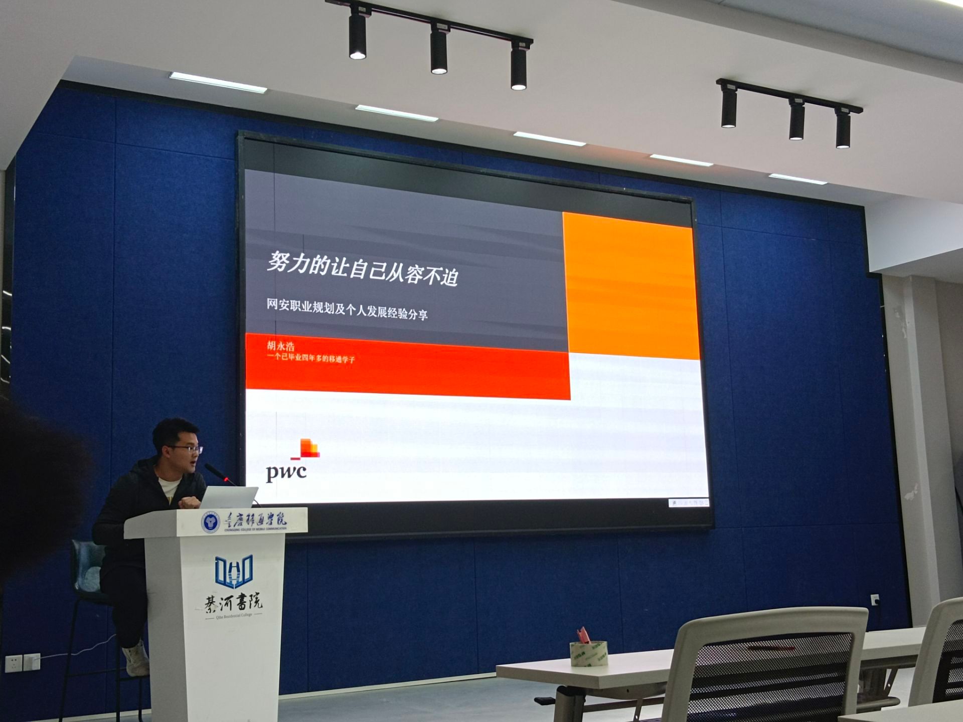 胡永浩学长以自身在工作中积累的经验和丰富的阅历为基础,深入浅出地为同学们讲解了网络安全行业的现状、就业知识和市场需求。在经验分享环节,他向同学们介绍了网络安全行业,安全岗位,安全公司,安全岗位技能树等。并强调了同学们在就业创业过程中应该关注地要点。为了全面培养同学们,他提出了在实践、物资、技能、个人方面全面培养的建议。