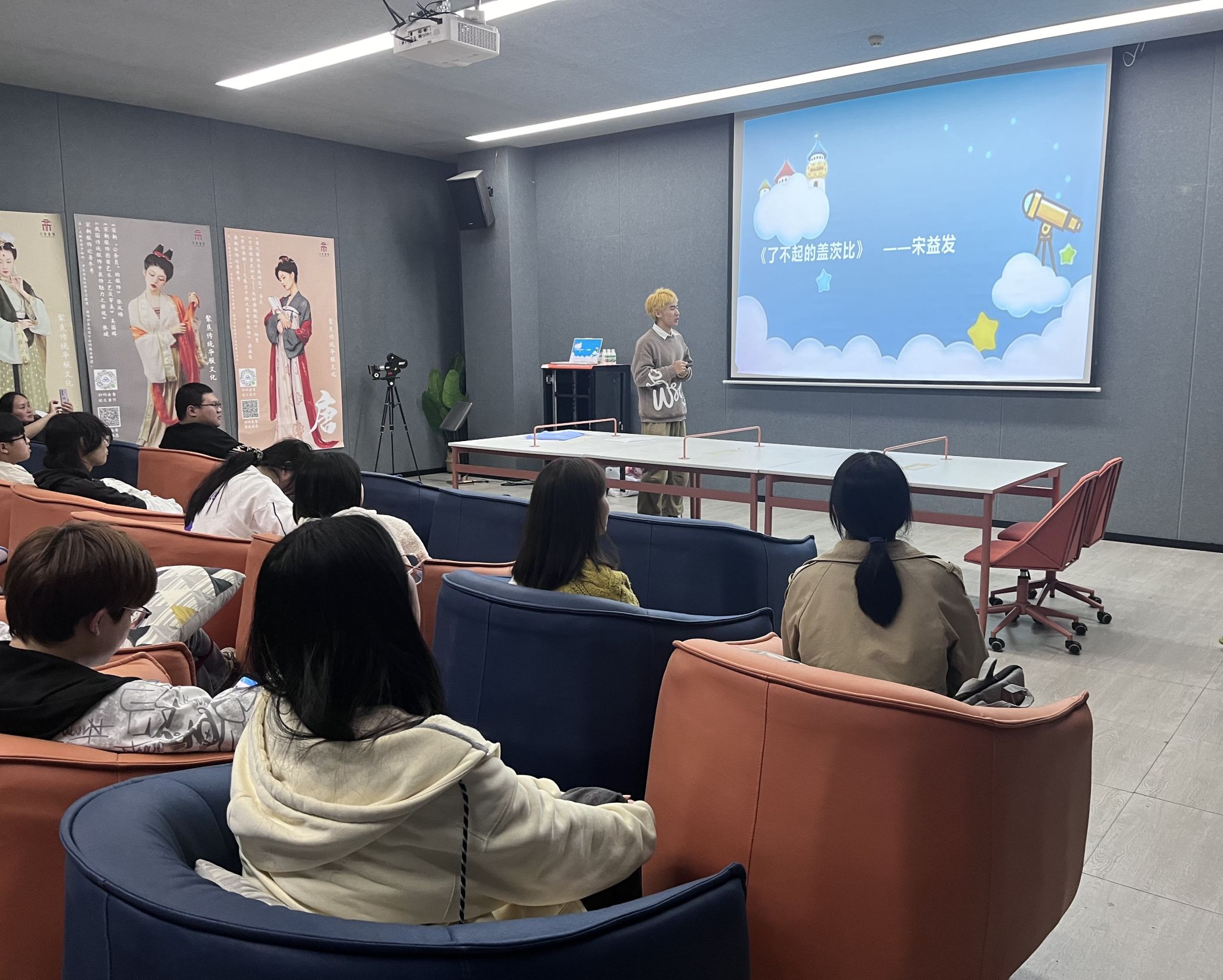 最后是由软件工程3班的宋益发同学分享的《了不起的盖茨比》一书,这一本来自美国咆哮的20年代的书,给我们讲了一个关于金钱、阶级的爱情故事。宋益发同学通过这个故事告诉同学们一个道理,不要被金钱蒙蔽了双眼。之后主持人蒋林锋同学提问式带动大家积极参与进行了一个爱情观的分享互动交流。