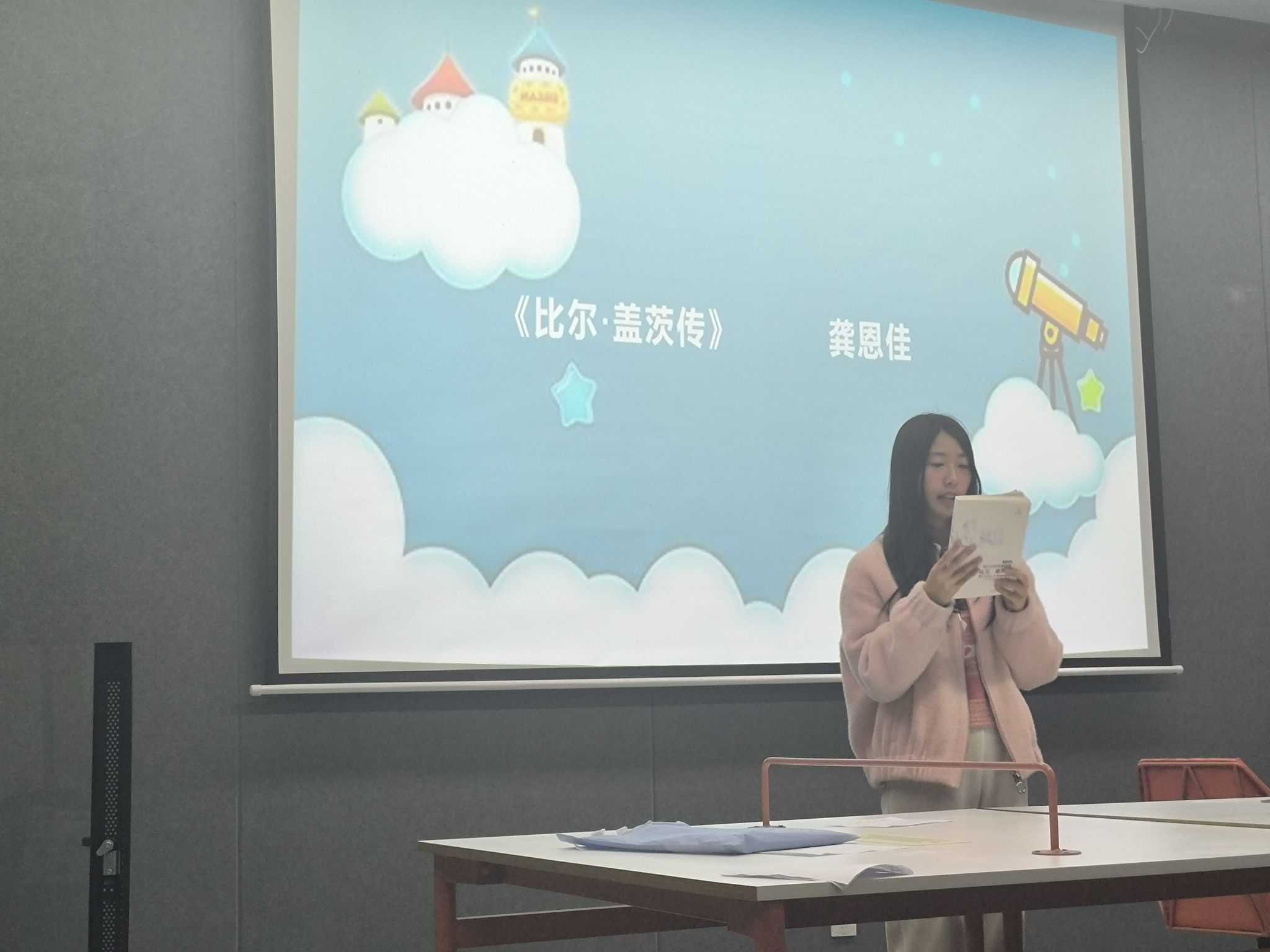 接着便由龚恩佳同学分享的大咖传记——《比尔·盖茨传》。作为举世闻名的富豪,他成功的例子是值得我们所有人去学习的。龚恩佳同学从盖茨的学习、创业、慈善等多个方面进行了介绍。通过详细又风趣地讲解,她让同学们知道了事业的成功离不开勤奋的学习,作为信息专业的学生,更要有把握前沿的视野。